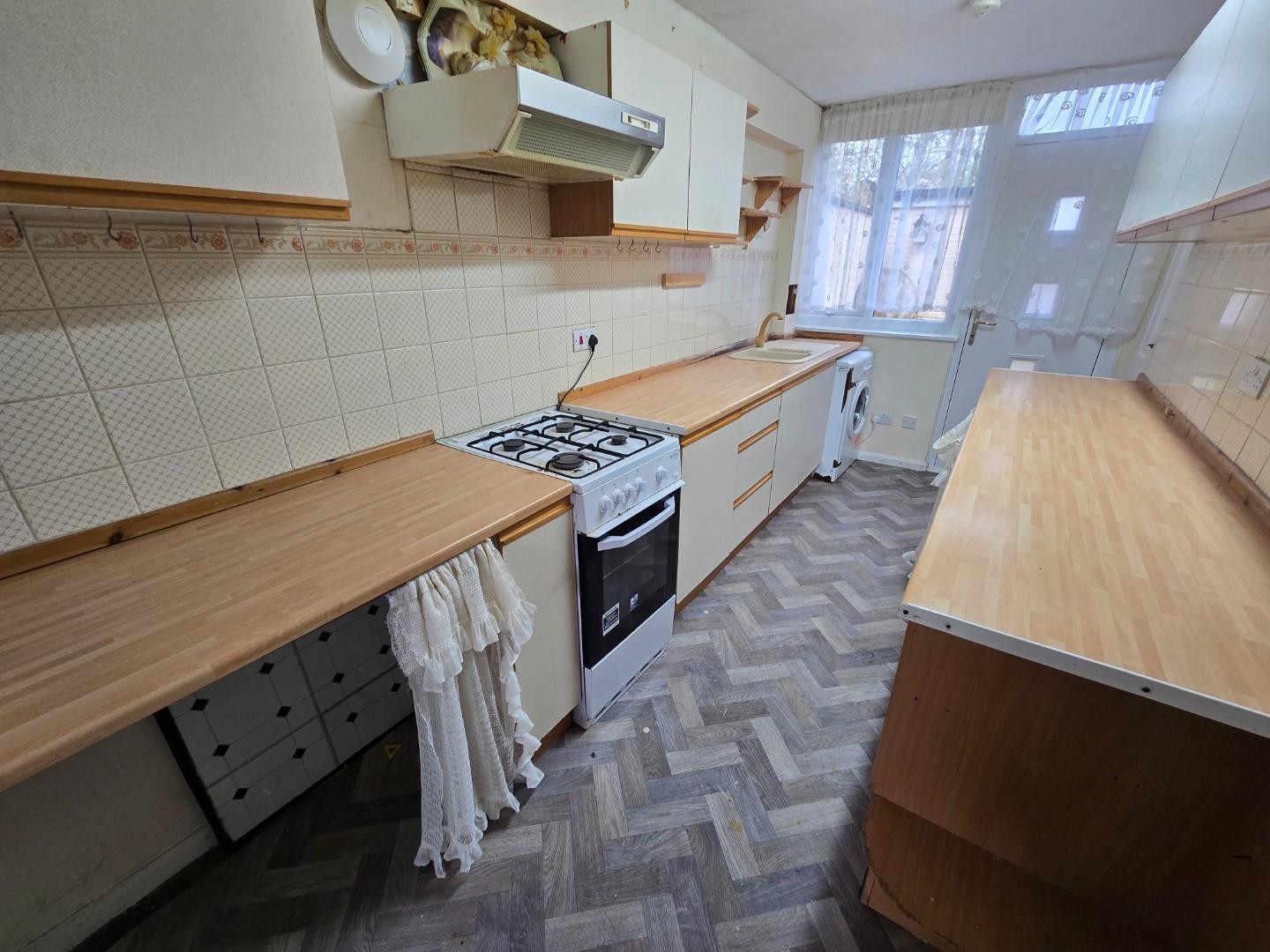Has a door to the rear, a rear facing double glazed window, radiator, ceiling light point, wall and base units with work surfaces and a storage cupboard.