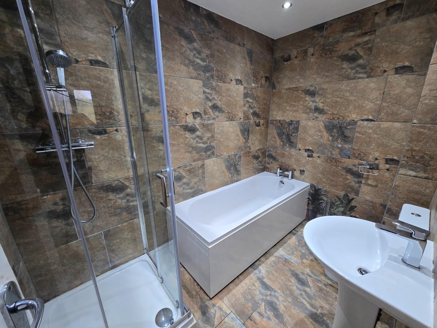 Has a heated towel rail, spotlights and a four piece suite comprising bath, shower cubicle, W.C. and sink.