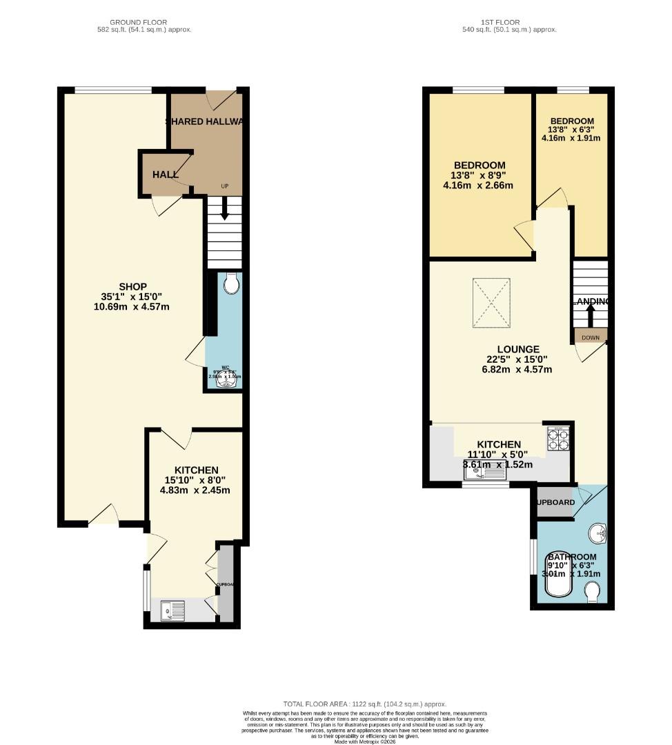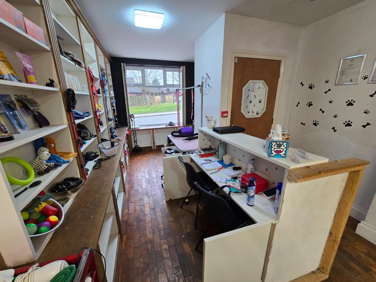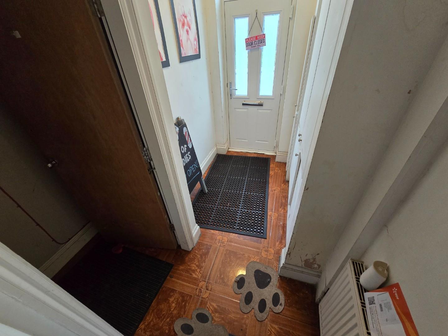 Door to the front, a door to the shop and stairs to the flat.
