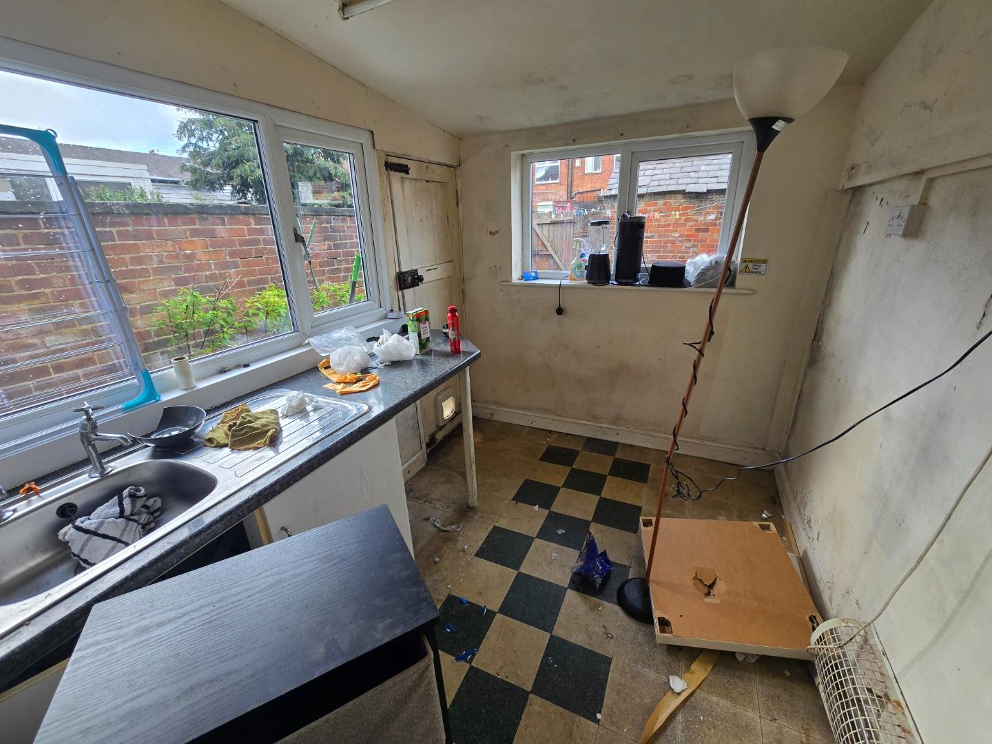 Has a door to the rear yard, a side facing double glazed window, a rear facing double glazed window, base units with work surfaces and a single sink unit with drainer.