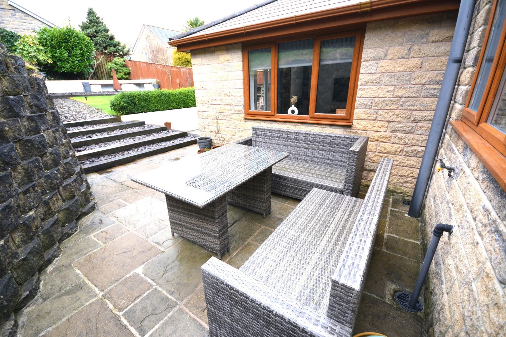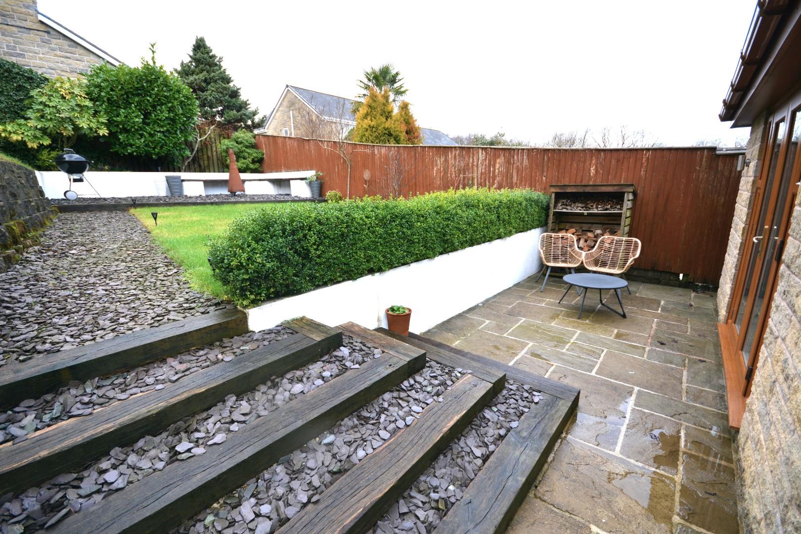 The rear garden is tiered and enclosed, with a neat lawn bordered by retaining walls and hedges. Steps from a paved patio lead up to the lawn, which offers a peaceful outdoor space with some planting and a sheltered seating area. The garden enjoys privacy and a lovely sense of space, ideal for relaxing or entertaining.