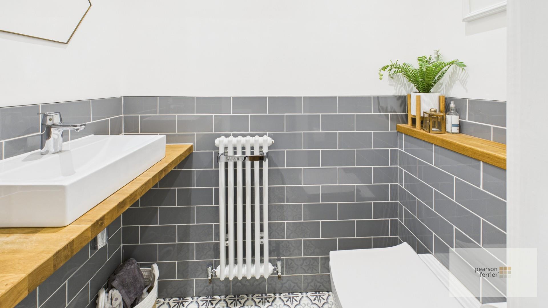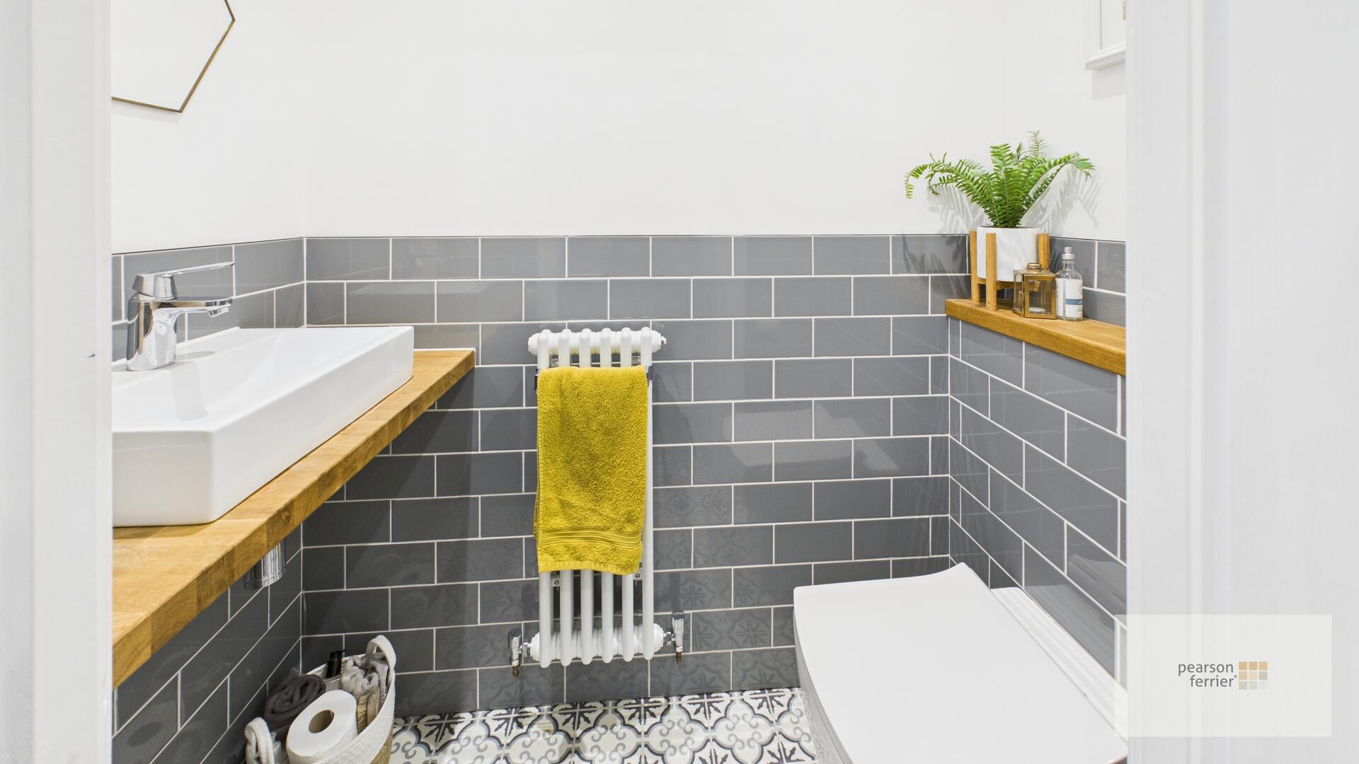 The ground floor WC is compact yet stylish, with patterned floor tiles and grey subway tiles halfway up the walls. It includes a contemporary wall-hung toilet and a wooden vanity shelf with a white basin, complemented by a towel radiator and a small window for ventilation.