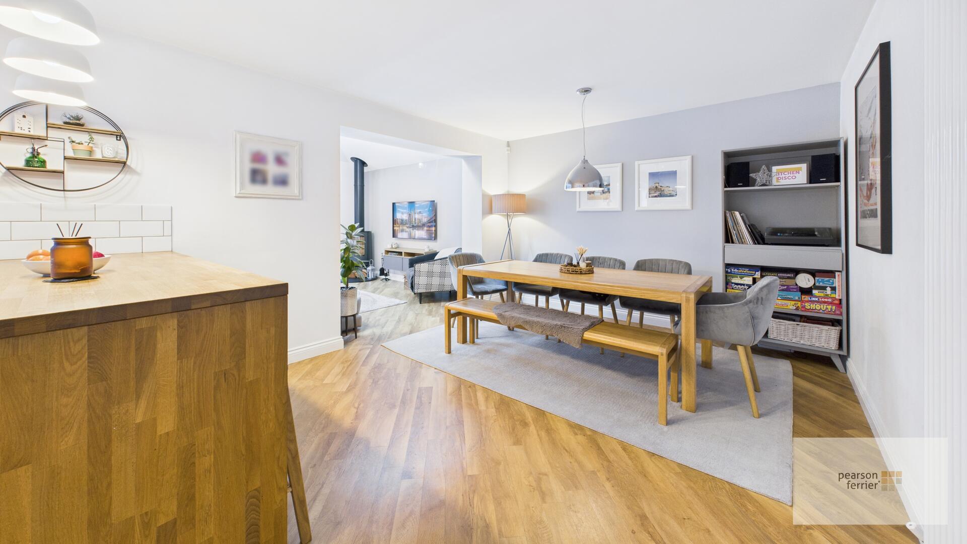 The kitchen and family room combine to create a spacious, modern area with a large central island featuring a wooden countertop and seating. White cabinetry and subway tile splashbacks are complemented by integrated appliances including, Neff Induction Hob, slide away Oven & integrated Microwave Oven, dishwasher. This open-plan space transitions seamlessly into the dining area, which comfortably seats 8 with a bench and chairs, and leads on to a sitting room through an open archway.