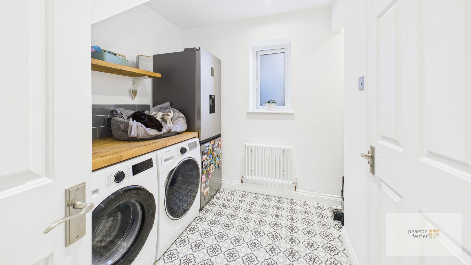 A practical utility room equipped with a wooden countertop, with additional space for a large fridge freezer. A small window allows natural light, and the room features patterned floor tiling and simple white walls, creating a useful and tidy space.