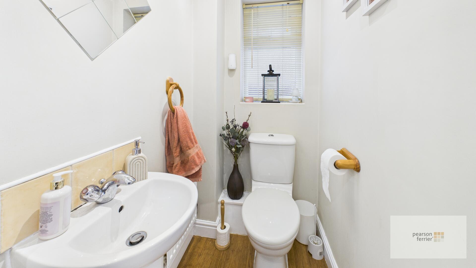 Double glazed frosted window to the side, three piece white suite comprising of: Low level w.c, pedestal hand wash basin and shower cubicle, tiled elevations, ceiling light point, radiator and extractor fan.