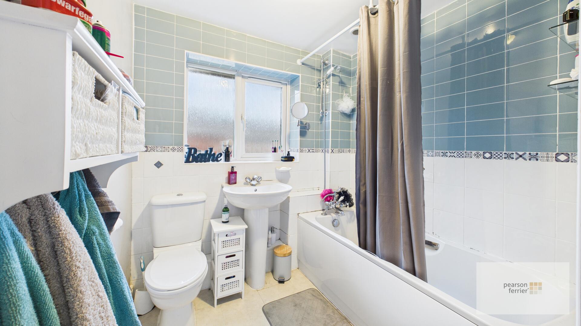 Double glazed frosted window to the rear, three piece white suite comprising of: Low level w.c, pedestal hand wash basin and panel bath with shower over, tiled elevations, ceiling light point, radiator and extractor fan.