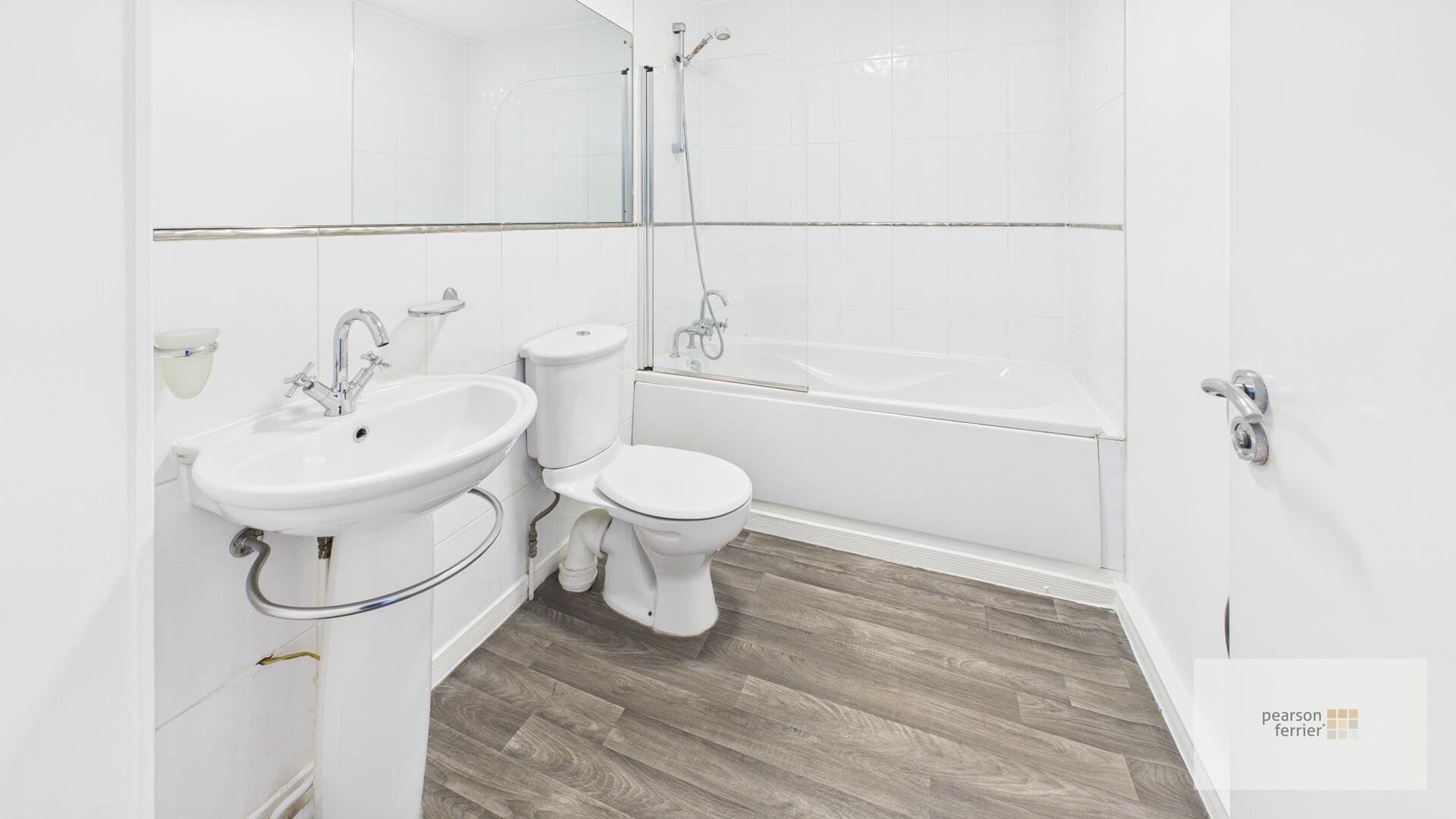 The bathroom comprises a pedestal sink, toilet, and a bath with a shower overhead, complemented by a large mirror and tiled splashbacks, heated towel rail.