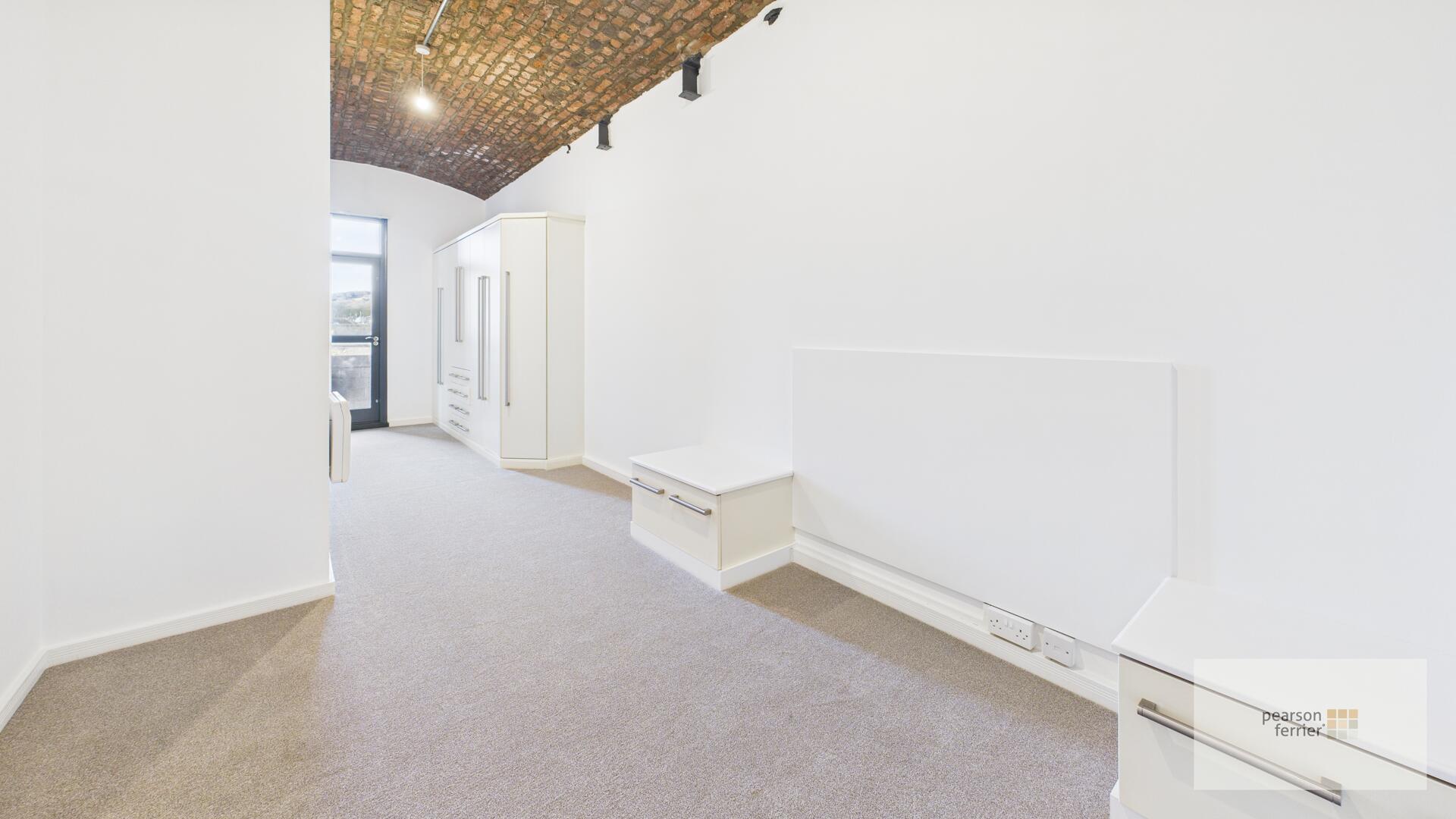 The bedroom is a generous space, with the same exposed brick ceiling detail, built-in wardrobes and drawers provide practical solutions while maintaining a clean and uncluttered feel, a door leads out to the balcony.