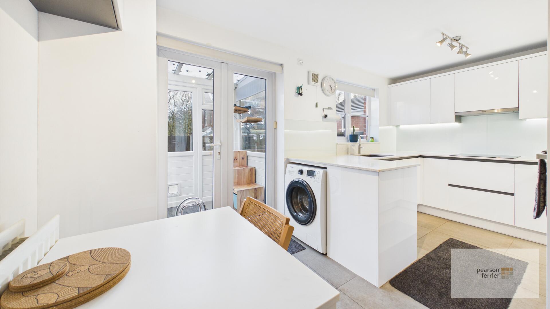 Kitchen fitted 2022 - Double glazed window and French style doors to the rear, selection of high gloss white wall & base units with Silestone work surfaces to complement, integrated Neff appliances dishwasher, fridge/freezer, microwave, electric oven & hob with extractor hood over. plumbed for washing machine, under stairs storage, sink & drainer, ceiling light points, radiator and extractor fan.