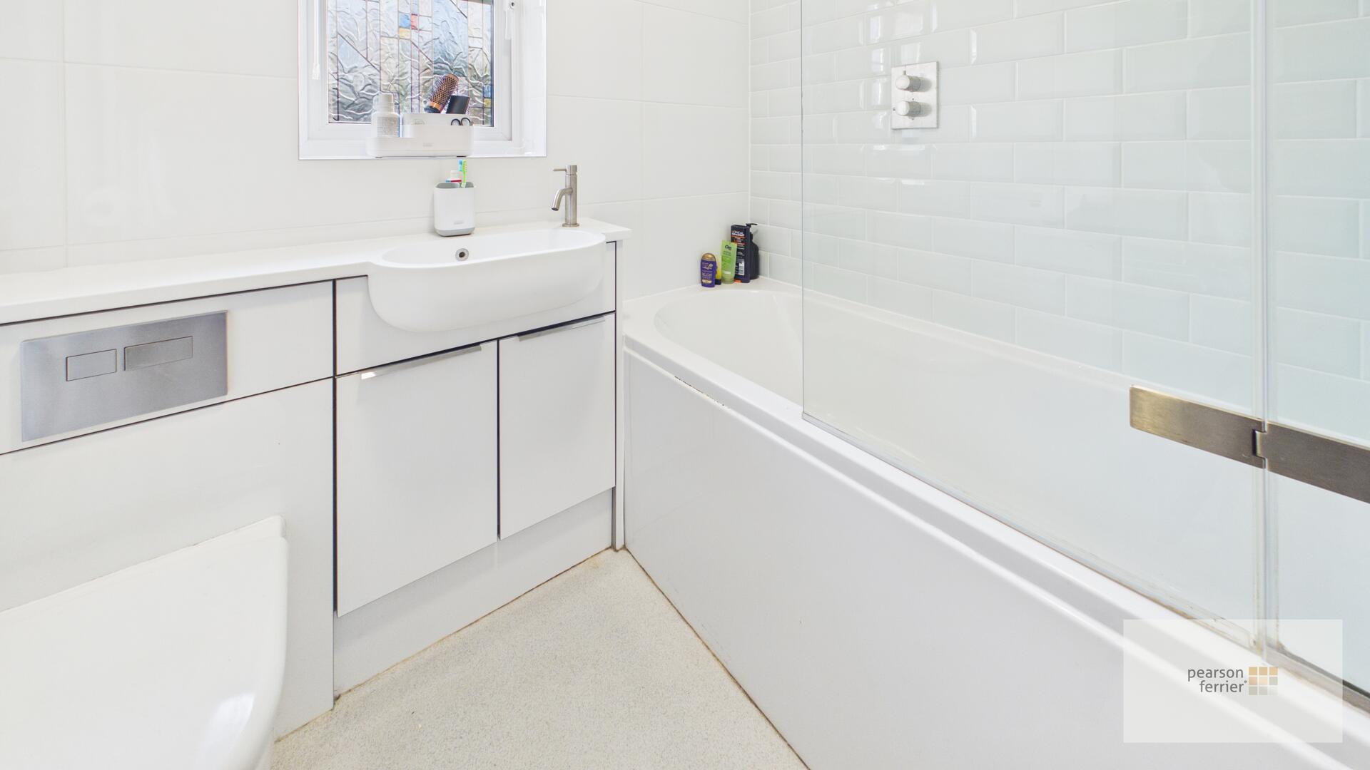 Fitted 2022 - Double glazed frosted window to the rear, three piece white suite comprising of: Low level w.c, hand wash basin set in vanity unit and panel bath with shower over, feature mirrored radiator, tiled floor & elevations, down lighting and extractor fan.