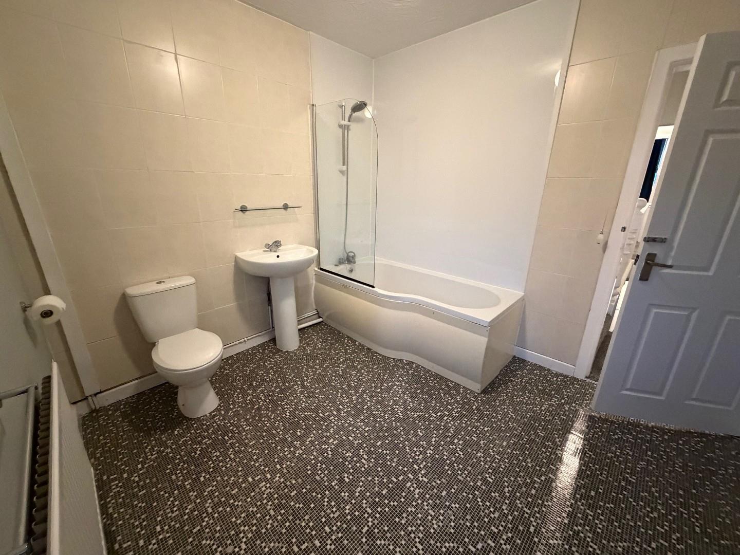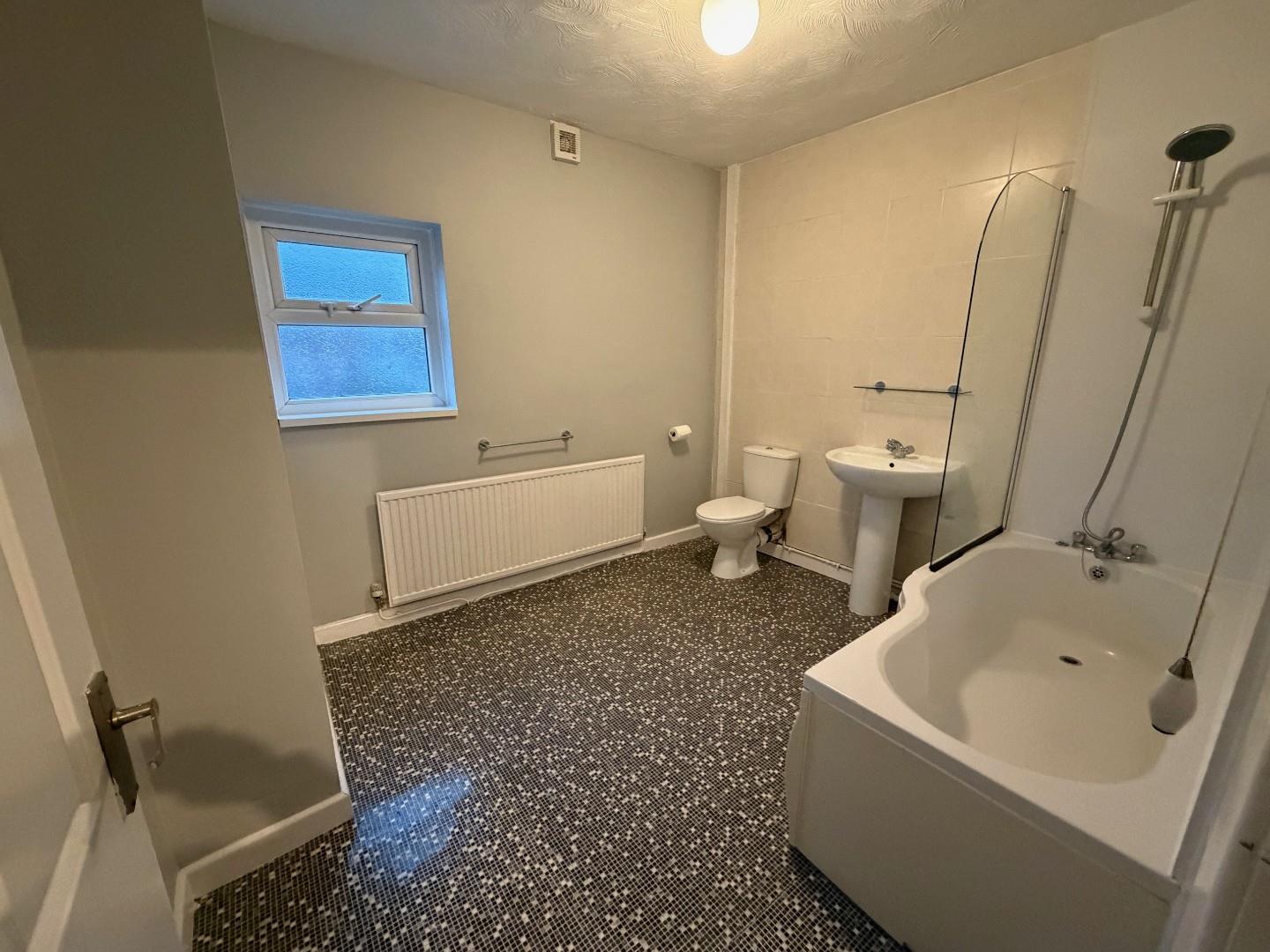 Rear facing UPVC double glazed window with frosted glass design, Three piece White suite comprising low level WC, pedestal wash hand, panelled bath, splash back tiling to compliment, single panelled radiator.
