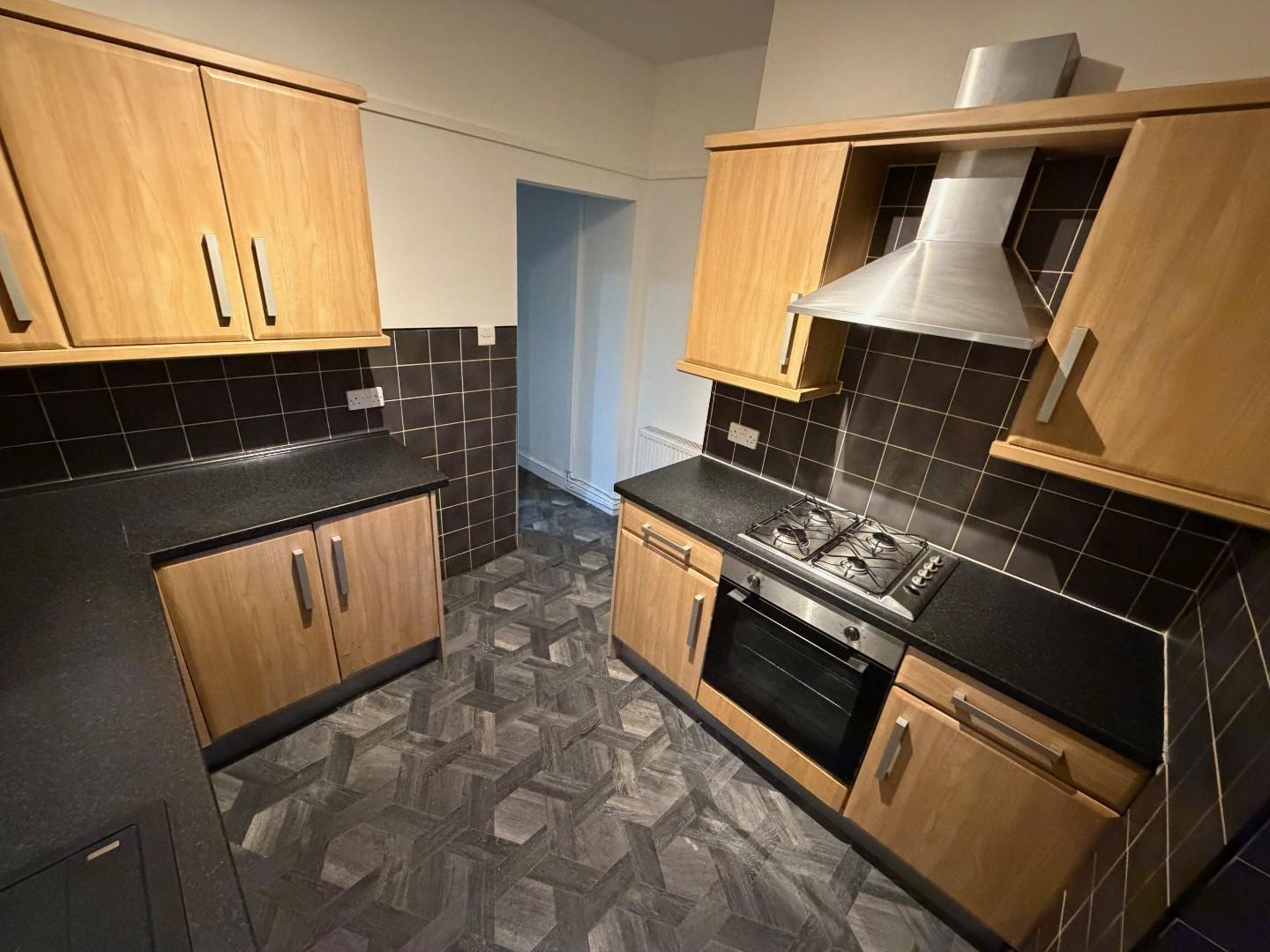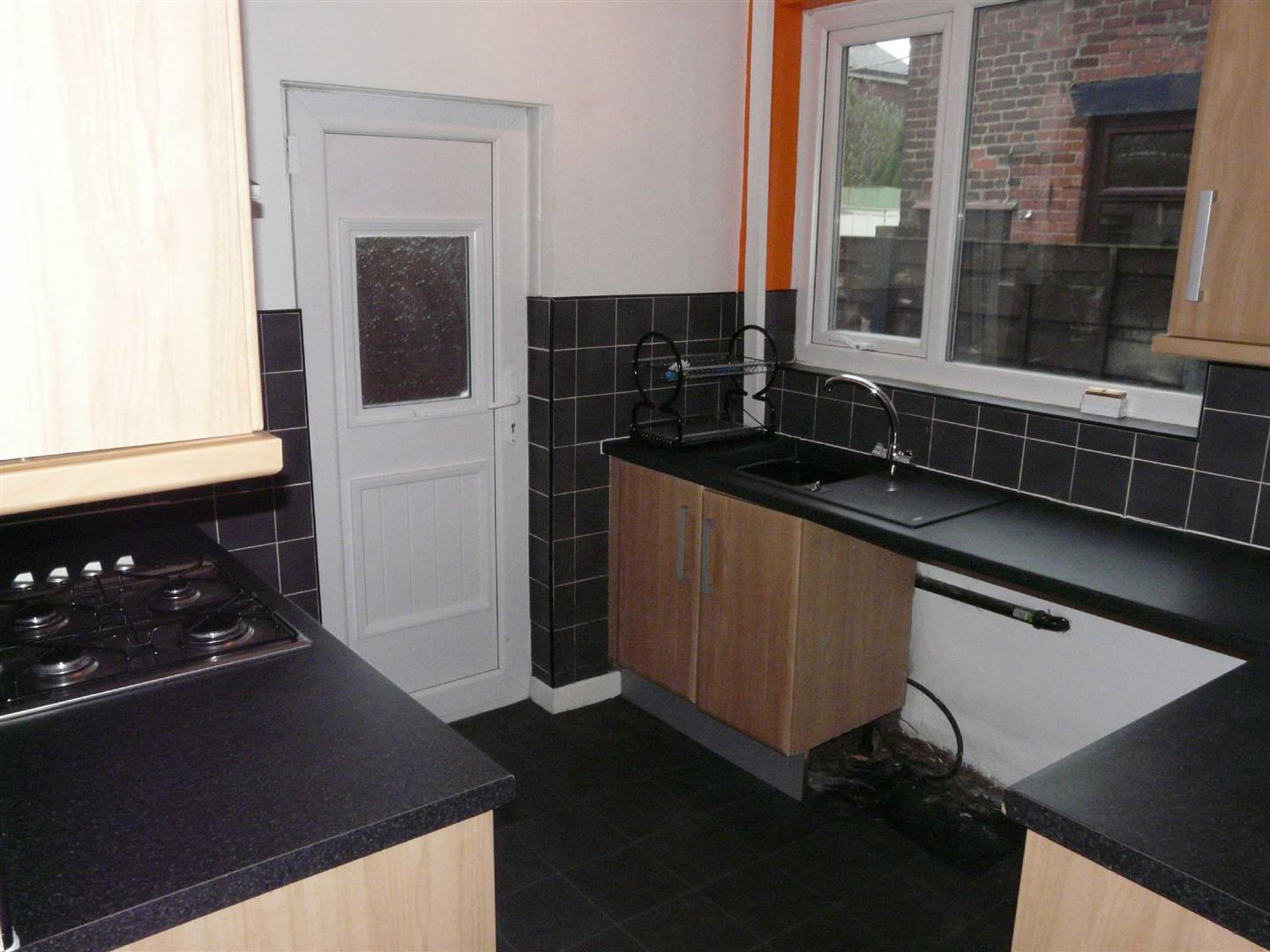Side facing UPVC double glazed window, UPVC door with frosted glass design leading out onto the rear enclosed yard, A range of modern fitted wall and base unit with complimentary moulded work surfaces incorporating a single drainer sink unit, plumbed for automatic washing machine, splash back tiling to compliment, numerous power points, integrated stainless steel oven, stainless steel four ring gas hob with stainless steel extractor canopy over.