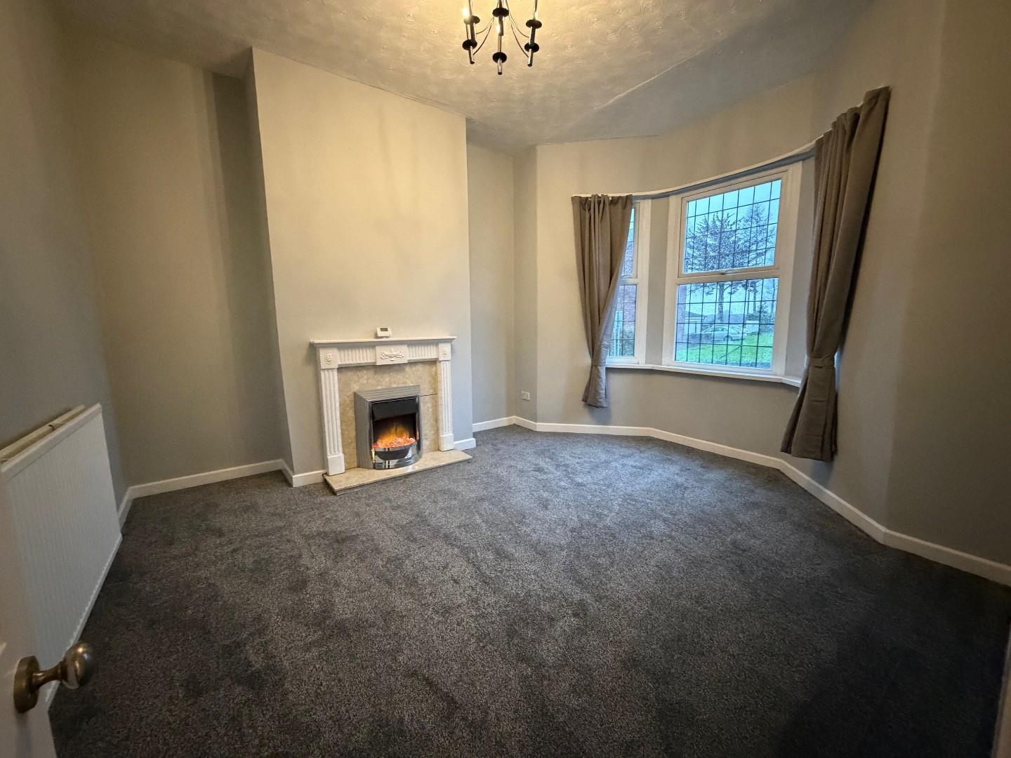 Front facing UPVC double glazed window with square leaded glass design, single panelled radiator, power points.