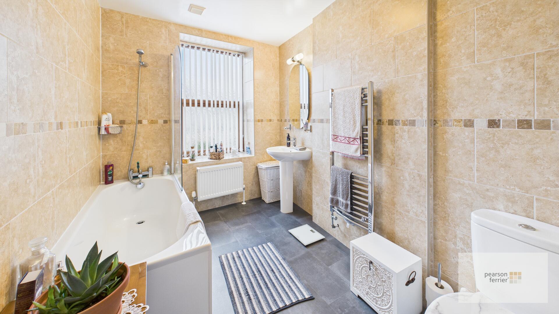 The bathroom is well-appointed with modern fittings, including a white bathtub, pedestal sink, and toilet. The walls are tiled in a warm beige tone with decorative border tiles, window to the front.