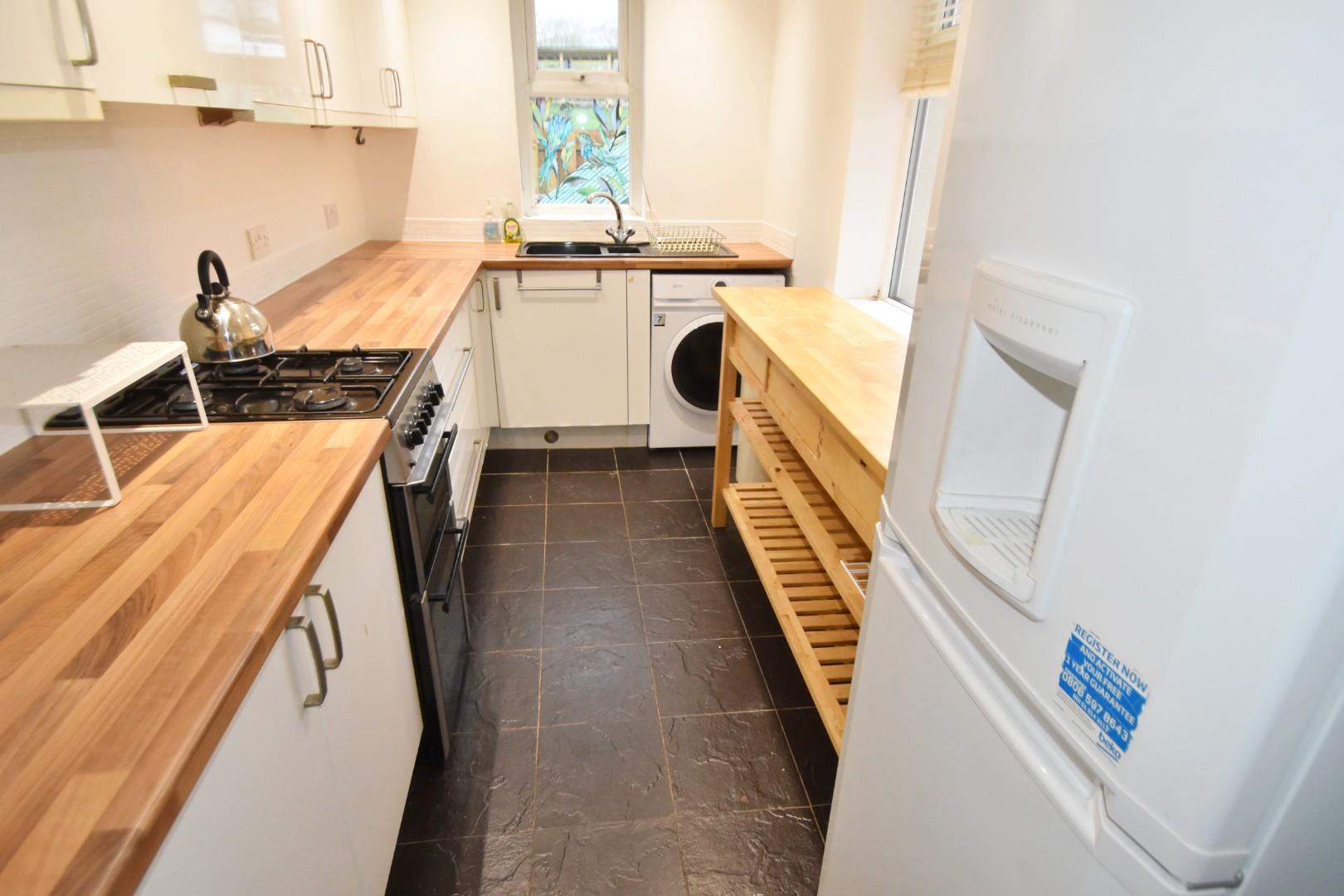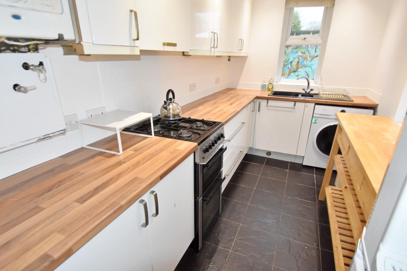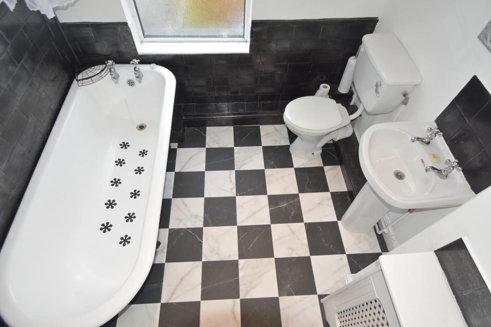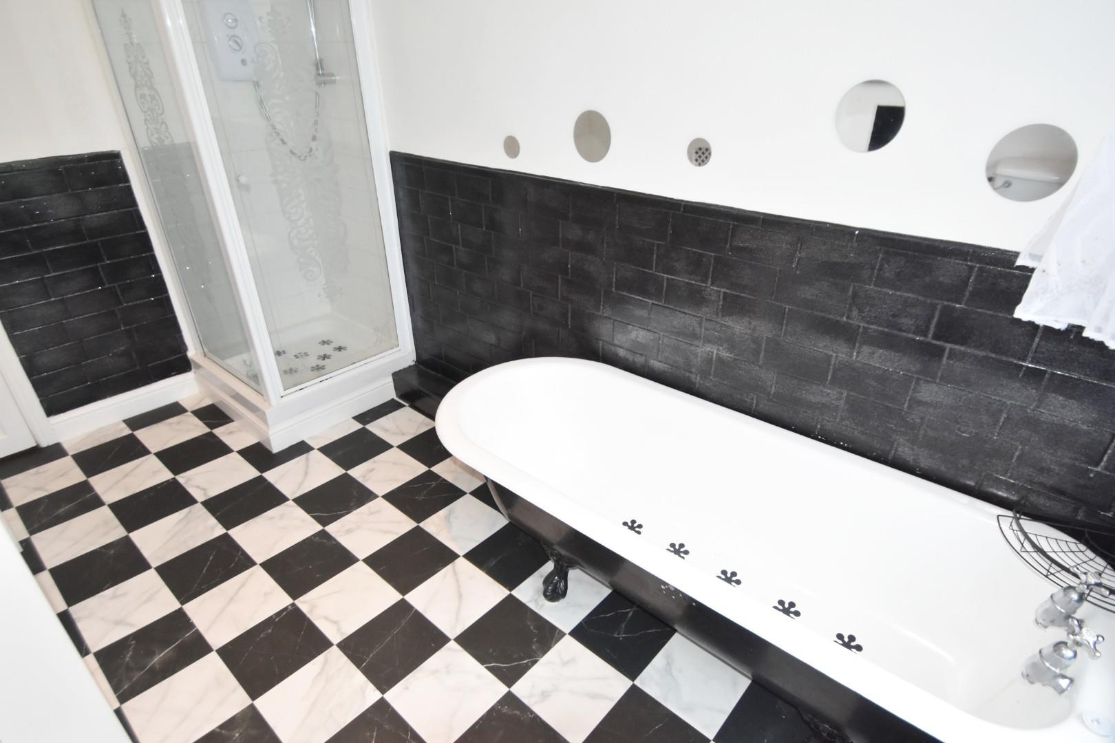 Cast Iron Roll Top bath. Walk in shower. Partially tiled.