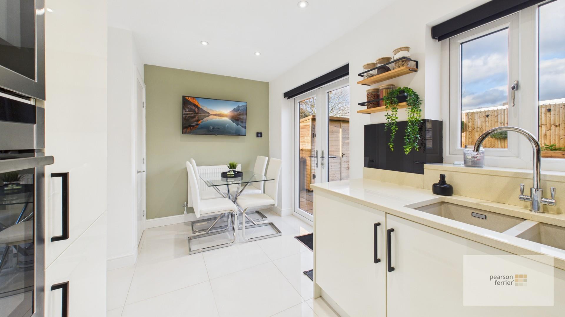 Fabulous range of recently installed wall & base units in gloss cream with black glass splashbacks and complementary cream quartz worktops with integrated sink unit. Range of fitted appliances by Neff to include: oven, combination microwave, electric hob, extraction system, fridge and freezer. Integrated dishwasher by Bosch. Tiled Flooring, LED lighting and patio doors leading out to the landscaped gardens. Remotely operated blinds.