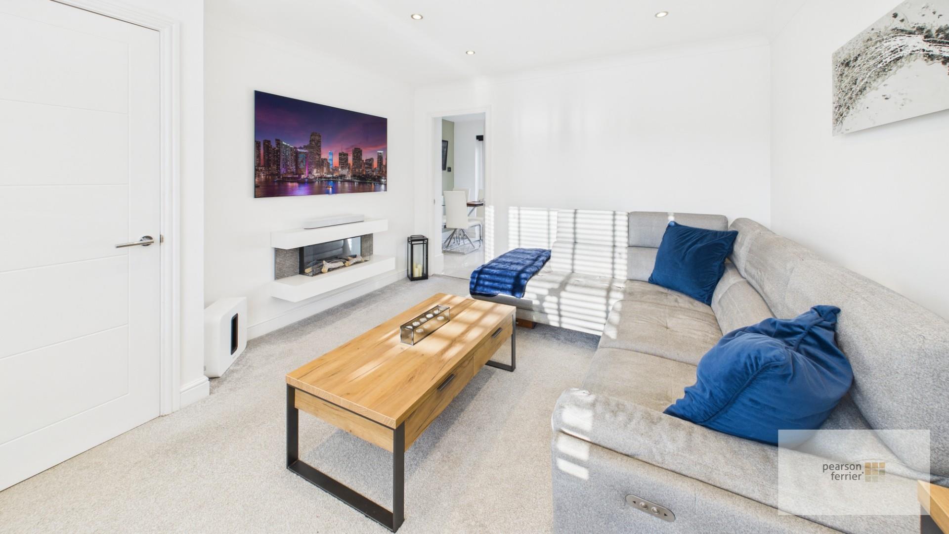 Contemporary wall mounted electric log effect fire. LED lighting and upvc double glazed window to the front with fitted blinds.