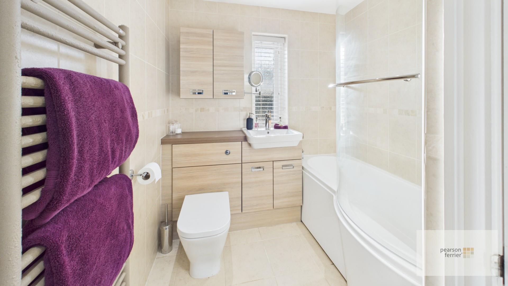 Beautifully fitted three piece suite in white comprising: a low flush w.c., vanity unit wash hand basin and 'P' shaped bath with thermostatic shower over. Tiled walls and tiled flooring. Airing cupboard housing the Worcester Combination boiler. LED Lighting. Upvc double glazed window to the front.