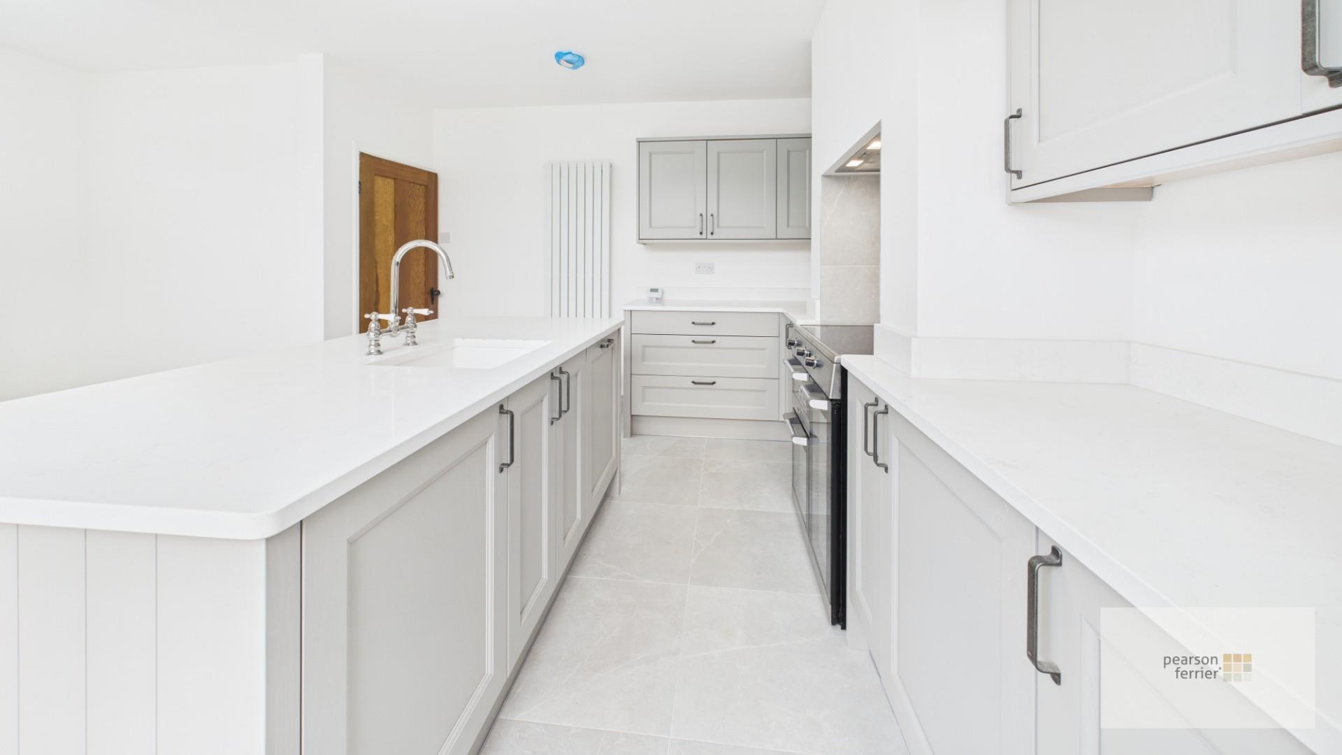 Comprehensive range of 'Shaker' style wall & base units in grey with quartz countertops and island unit housing the sink with mixer tap. Built in appliances to include fridge, freezer, dishwasher and freestanding electric range cooker with induction hob. Tiled flooring, bay window to the rear with views over the gardens, dining area and access to rear patio and boiler room.