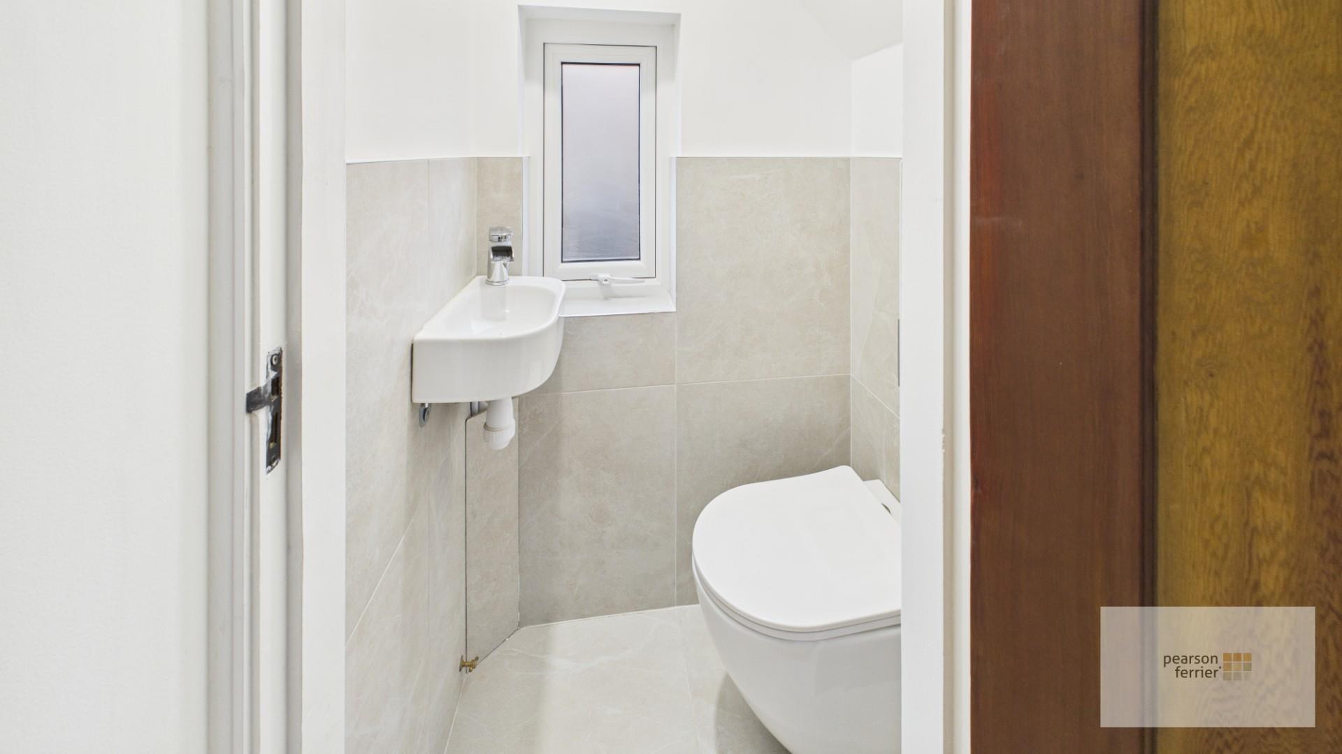 Two piece suite comprising a contemporary w.c. and wash hand basin. Window to the side and tiled flooring.