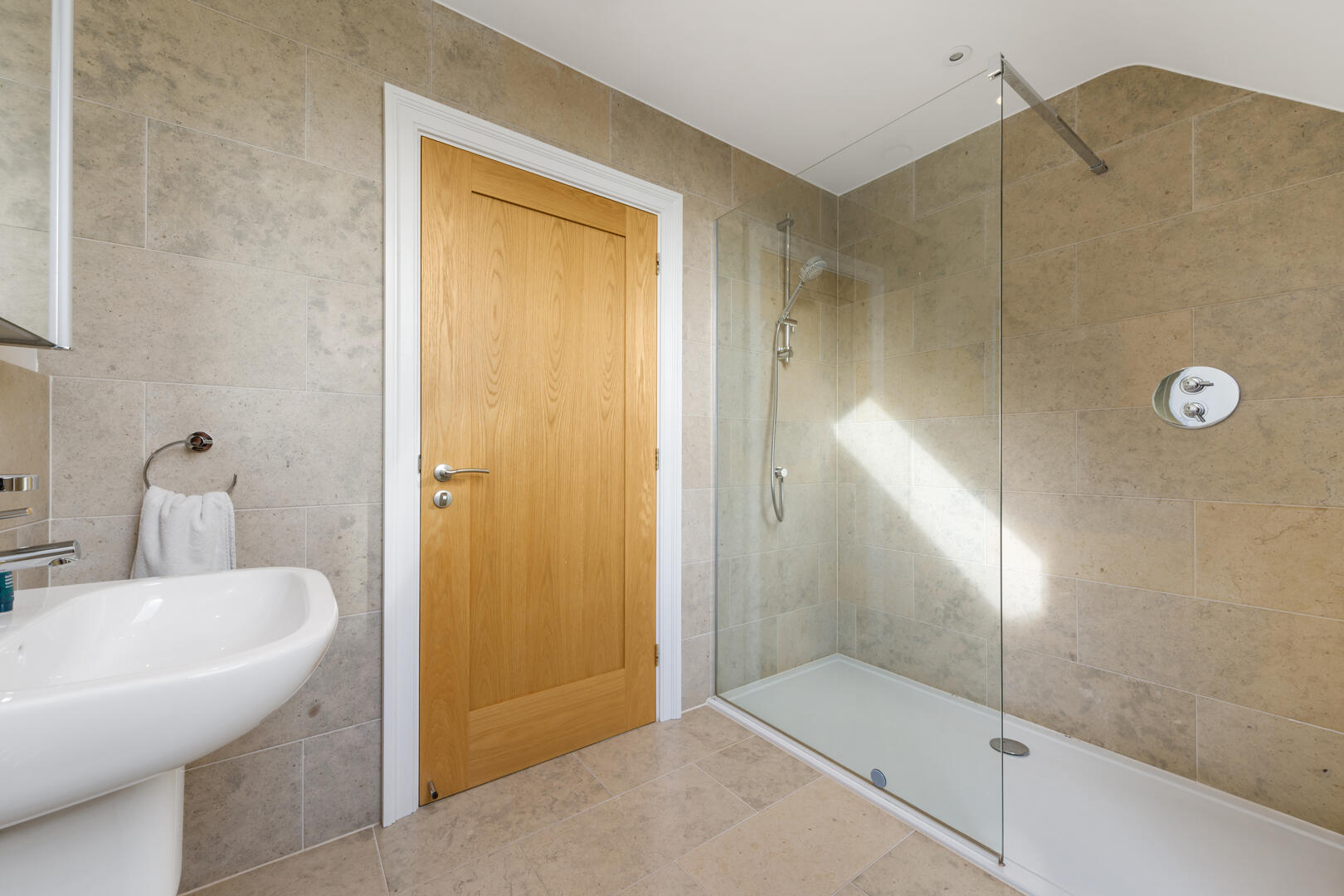 Shower room briefly comprising, WC, wall mounted basin, oversized shower cubicle, heated towel rail, Moleanos blue-beige tiled elevations and flooring, Velux to the rear.
