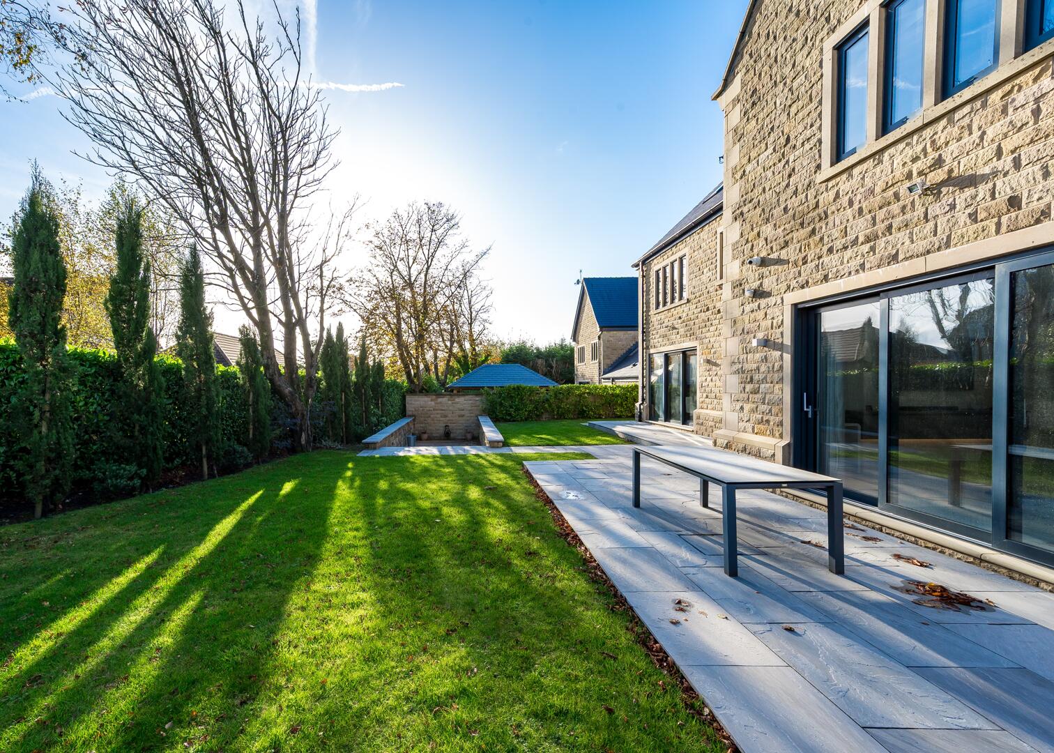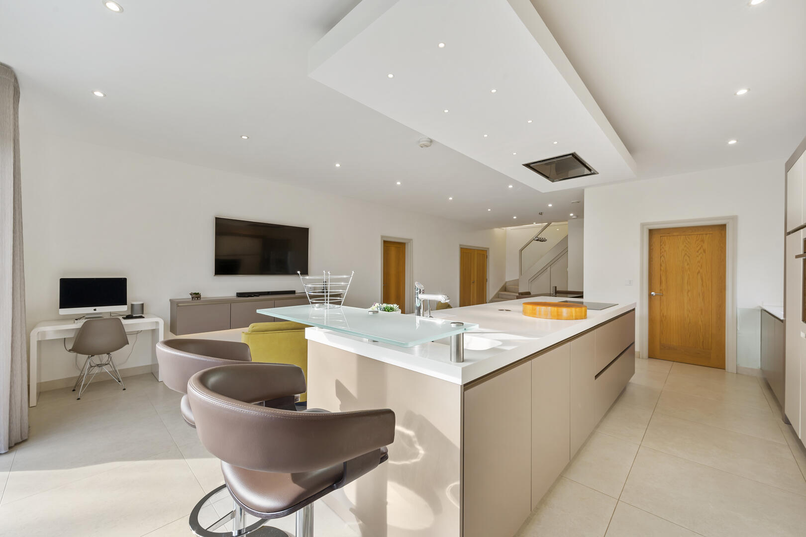 Large family kitchen with Stuart Fraser design, wall and base units, large island console with LED feature lighting and inset sink with 4 in 1 Zip tap, NEFF appliances include induction hob, two ovens, microwave, plate warming drawer, dishwasher, porcelain tiled flooring, stairs to the upper floor office, window to the side, sliding patio door to the rear.