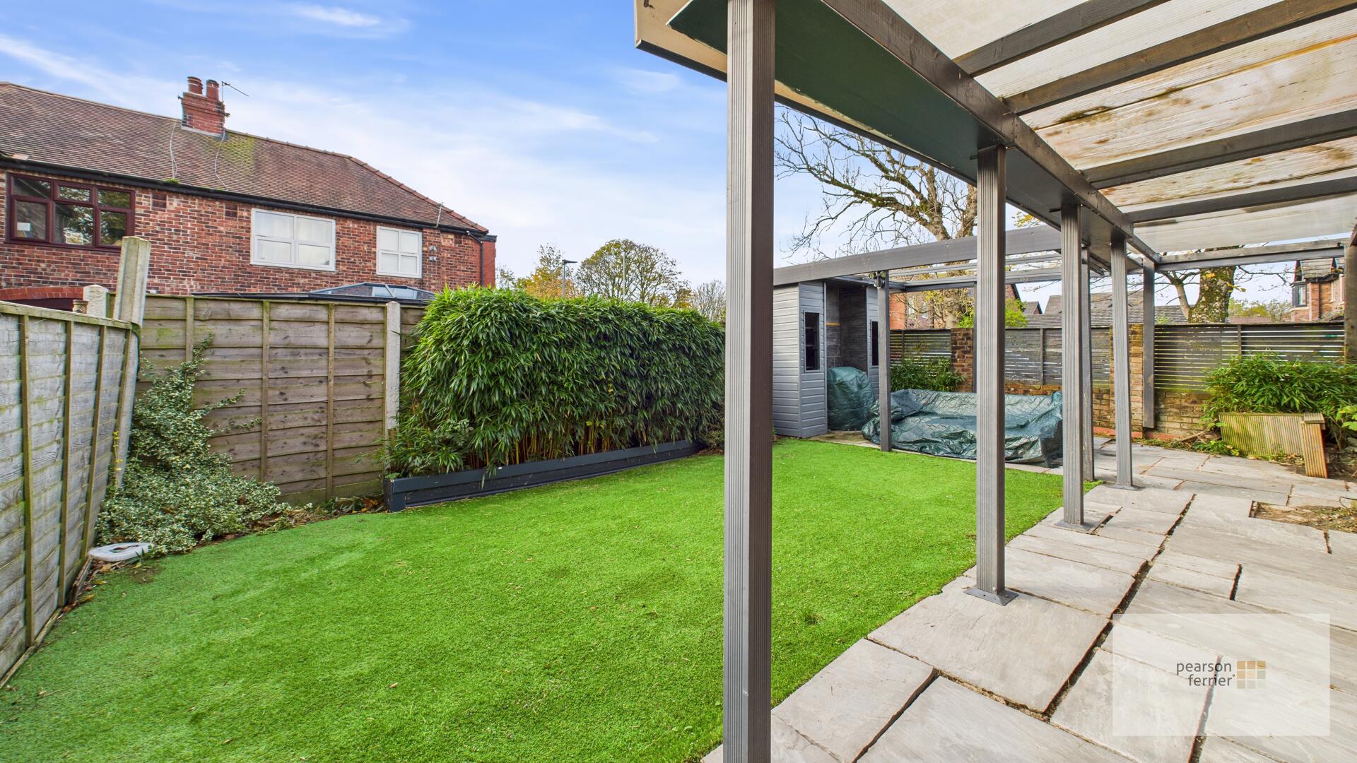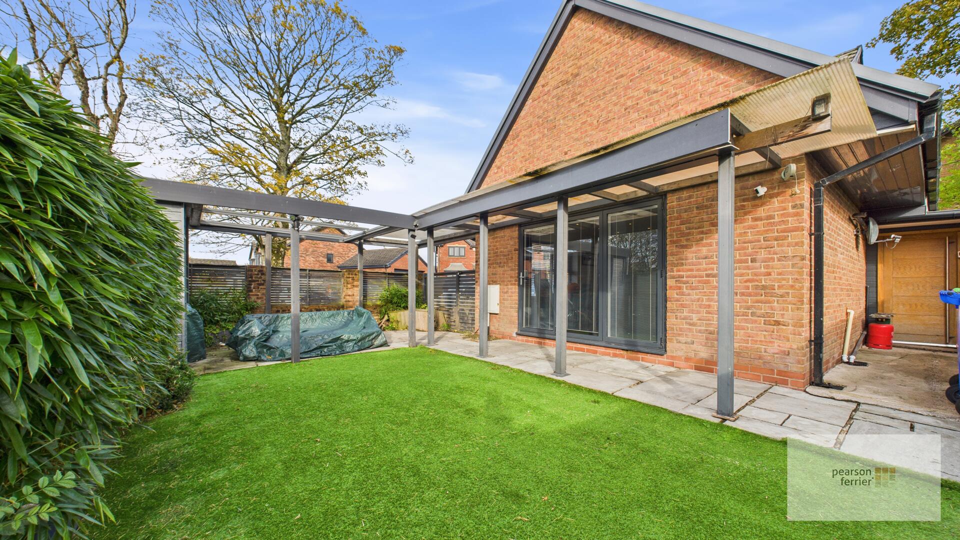 Low maintenace garden with artificial grass, paved patio with pergola, fence surround and gate access to the front.