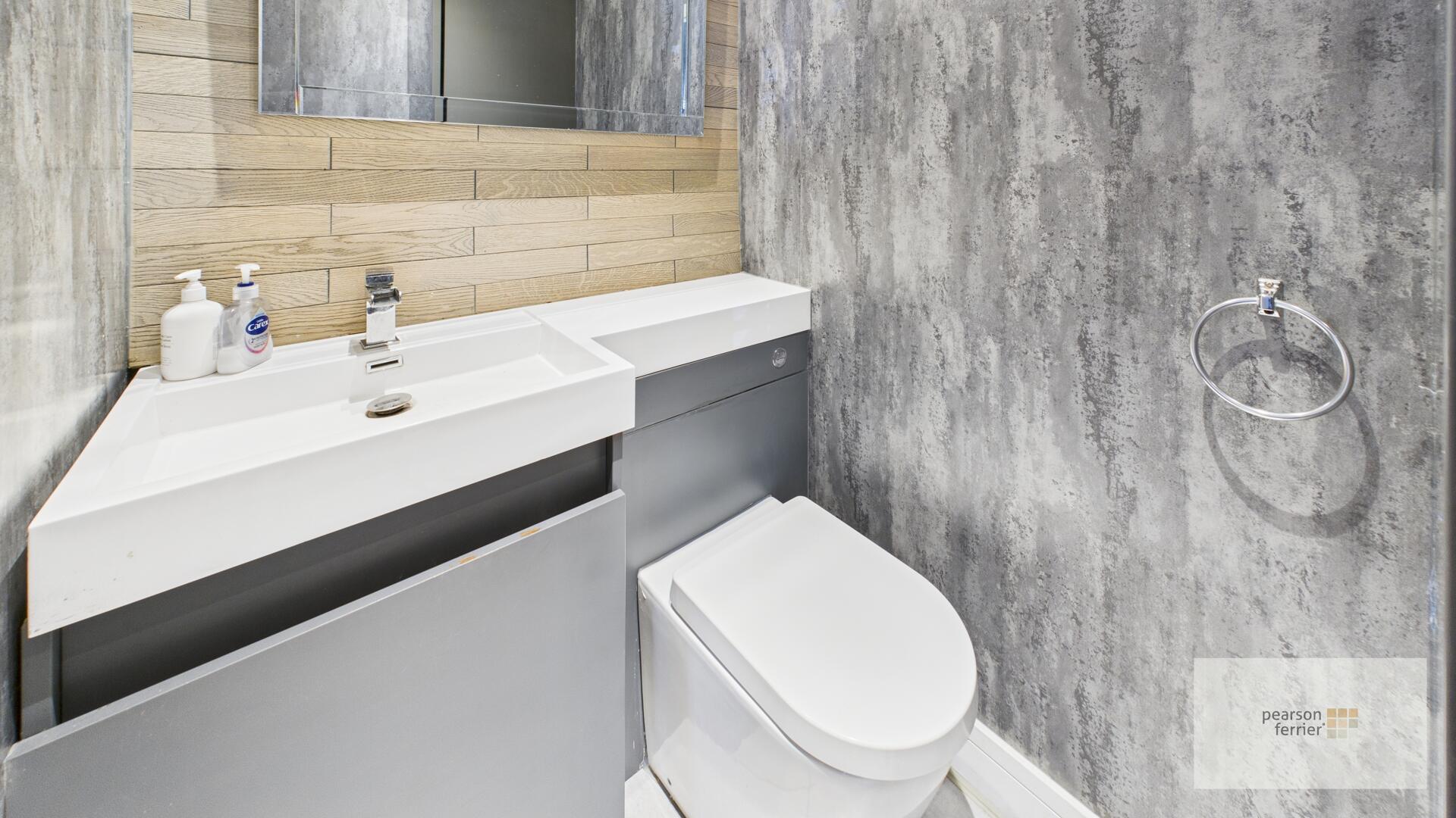 Two double glazed frosted windows to the rear, three piece white suite comprising of: Low level w.c, wall mounted hand wash basin set in vanity unit and panel bath with rainfall shower over, tiled floor & elevations, heated towel rail, down lighting and extractor fan.