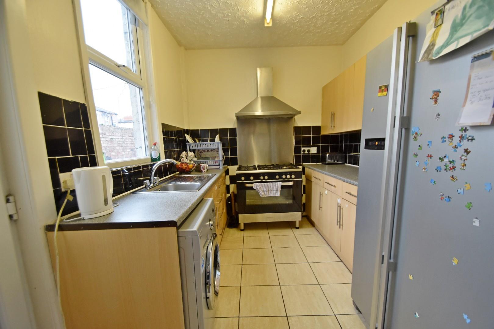 Range of wall & base units in light oak finish with contrasting worktops incorporating a single drainer sink unit. Free standing range cooker with extraction system over. Upvc double glazed window to the side and access onto the rear yard via upvc door. Access to basement.
