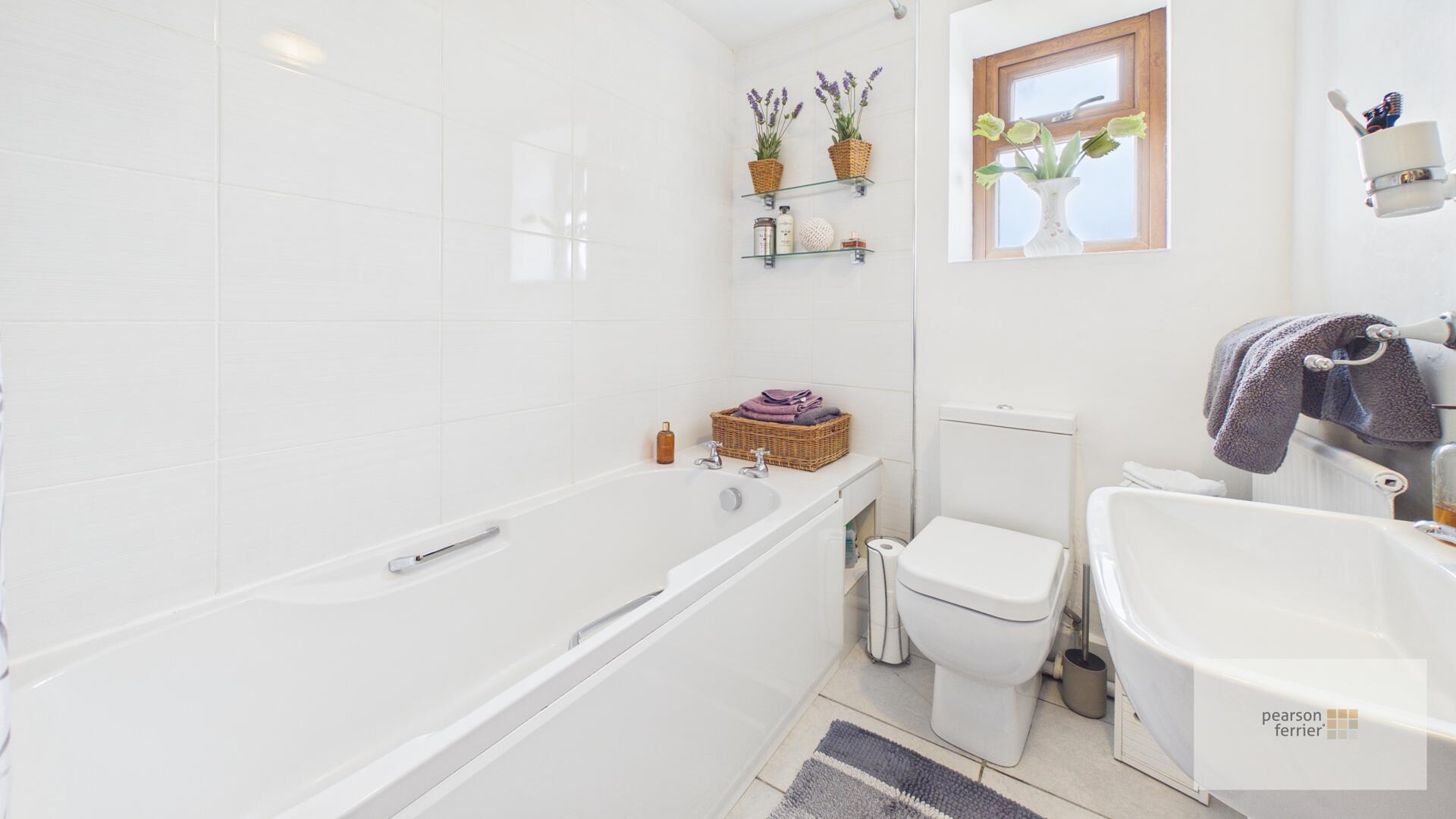 Double glazed frosted window to the rear, three piece white suite comprising of; Low level w.c, pedestal hand wash basin and panel bath with shower over, tiled elevations, ceiling light point and radiator.