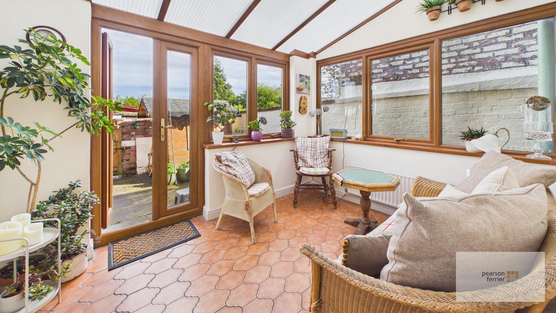 Double glazed surround & double glazed French style doors to the rear, tiled floor, wall lights and radiator.