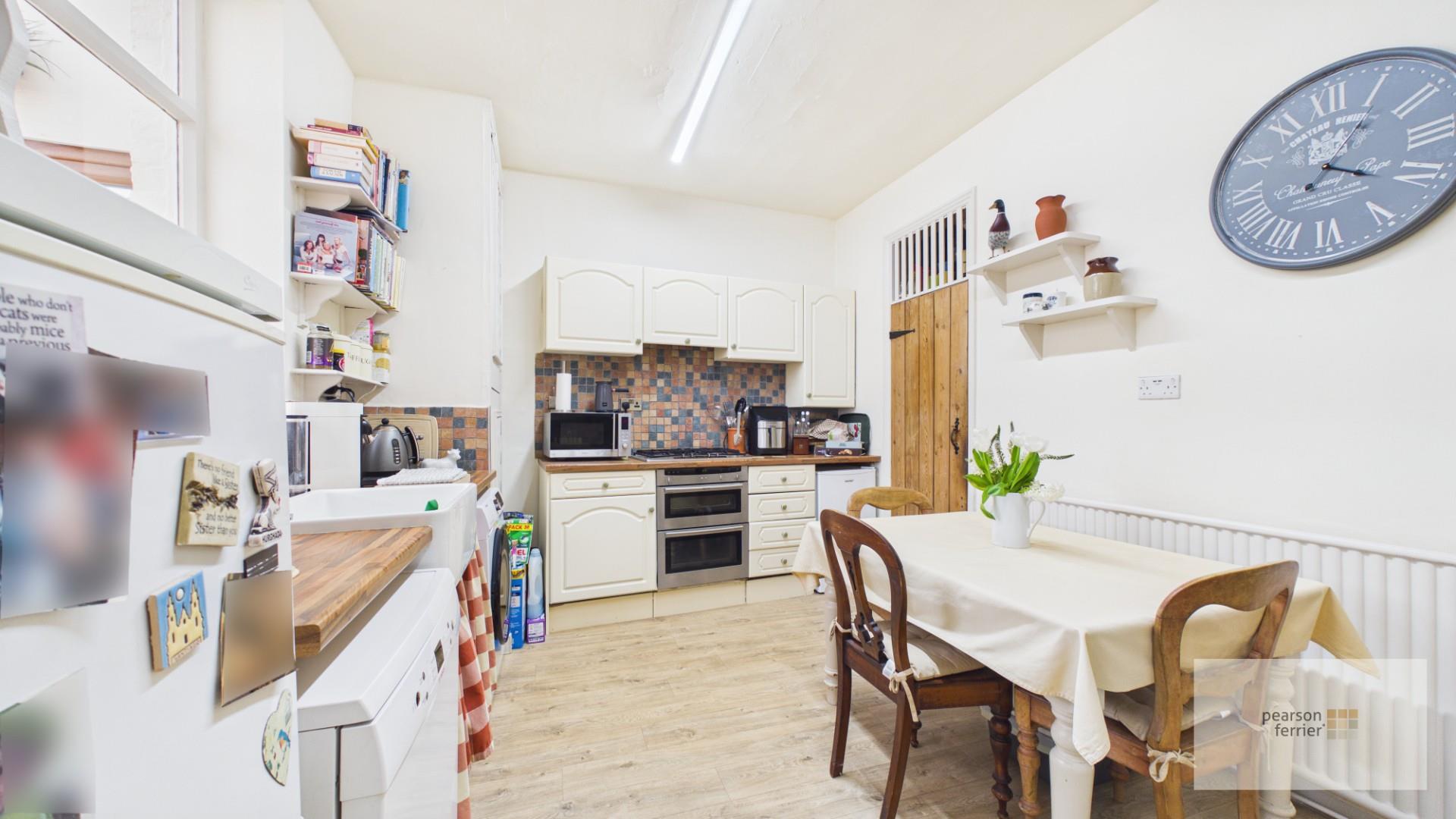 Double glazed window & door access to the rear, selection of wall & base units with work surfaces to complement, Integrated double eclectic oven & gas hob with extractor hood over, plumbed for washing machine & dishwasher, space for fridge/freezer, Belfast style sink, under stairs storage, ceiling light point, radiator and stairs to the first floor.