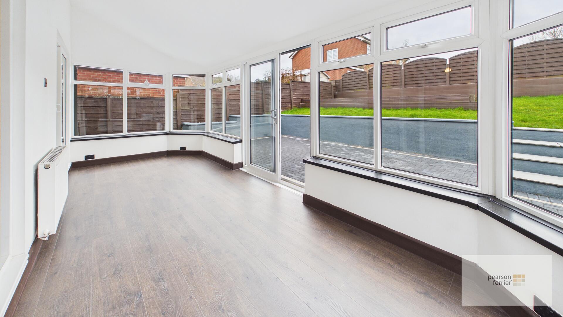 Double glazed surround with double glazed patio doors to the rear, wall light and radiator.