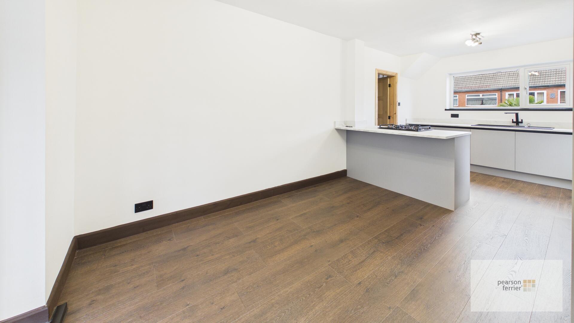 Newly fitted kitchen comprising of: Selection of wall & base units with work surfaces to complement, breakfast bar, integrated fridge/freezer, dishwasher, washing machine, electric oven and gas hob, wall mounted gas fired Baxi boiler, ceiling light point, radiator, double glazed window to the front and double glazed patio doors to the rear.