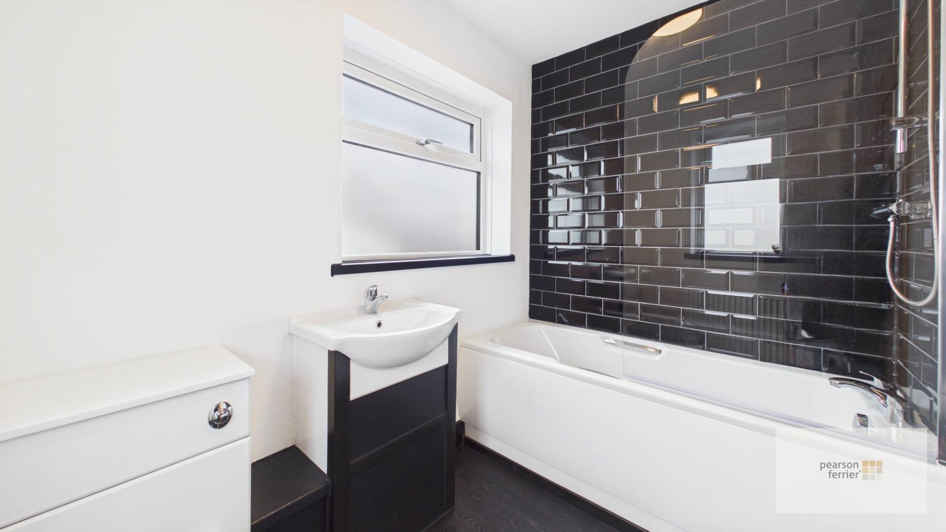 Double glazed frosted window to the front, three piece white suite comprising of: Low level w.c, pedestal hand wash basin and panel bath with shower over. tiled elevations, ceiling light point and radiator.