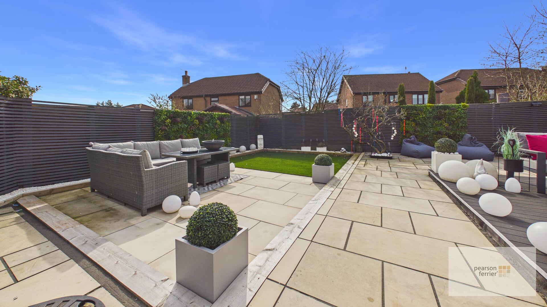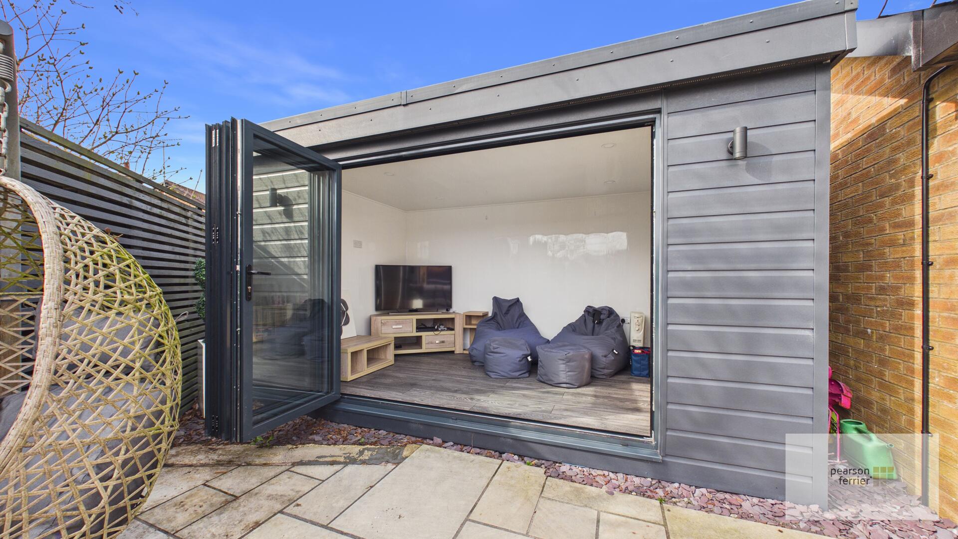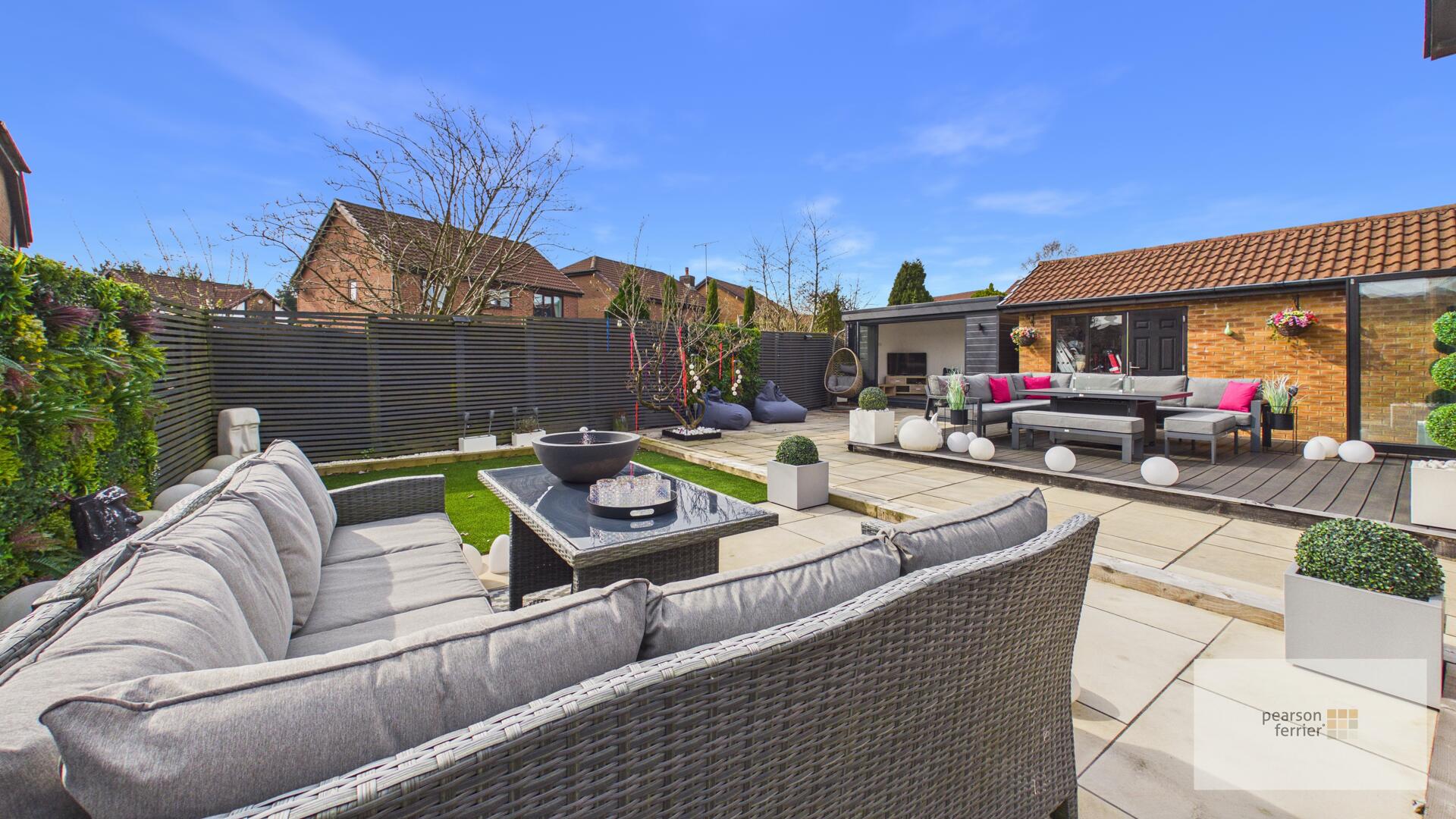 Outside there is a large adjoining area of land to the front with putting green and extensive parking/hardstanding ideal for a caravan or motorhome, paved forecourt and side driveway c/w EV charging point leading to a detached garage. There are large westerly facing professionally designed gardens at the rear with paved patio, composite decking and seating areas with astro turf lawns. There is also a garden studio pod ideal as an office or gym.