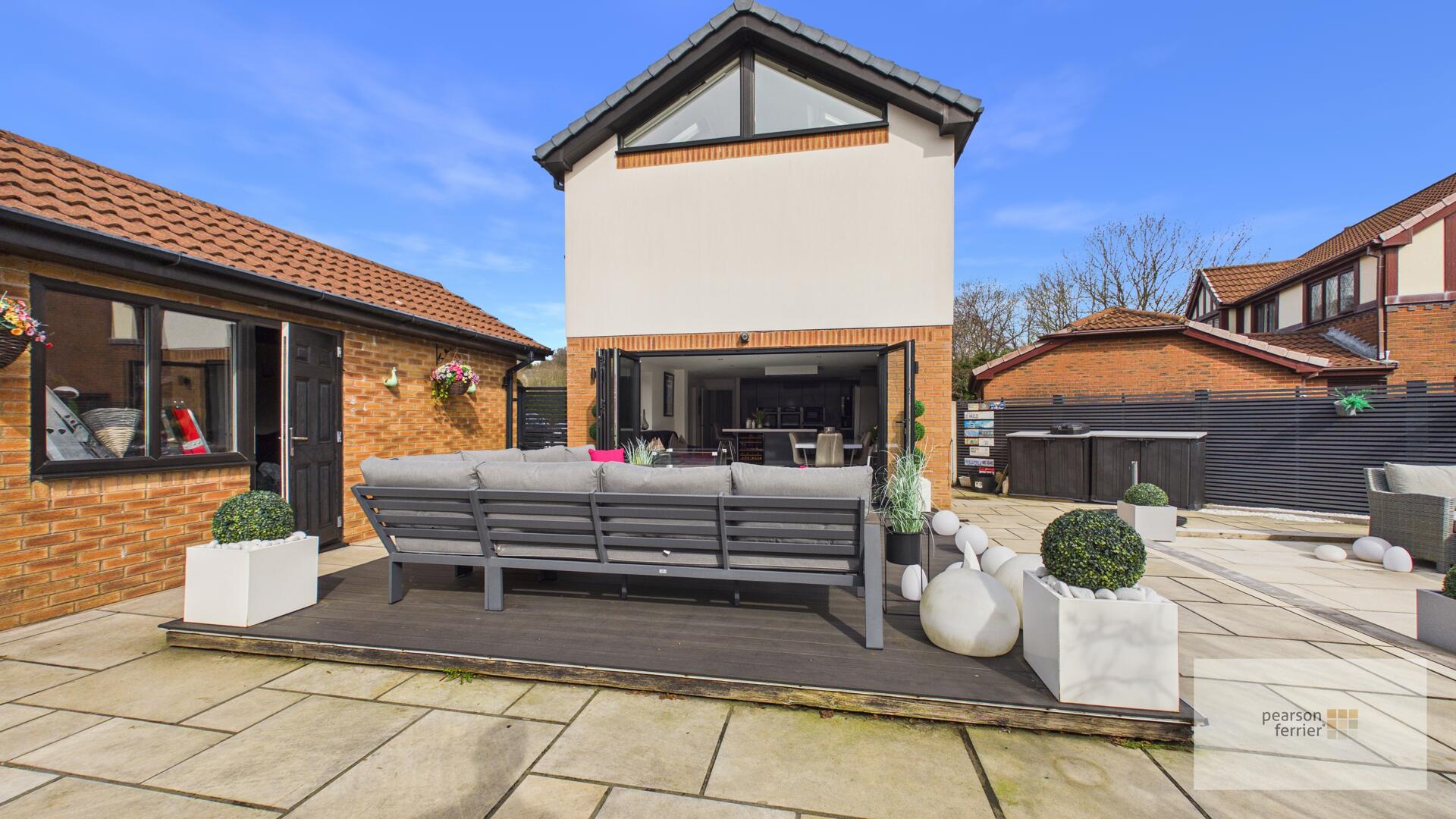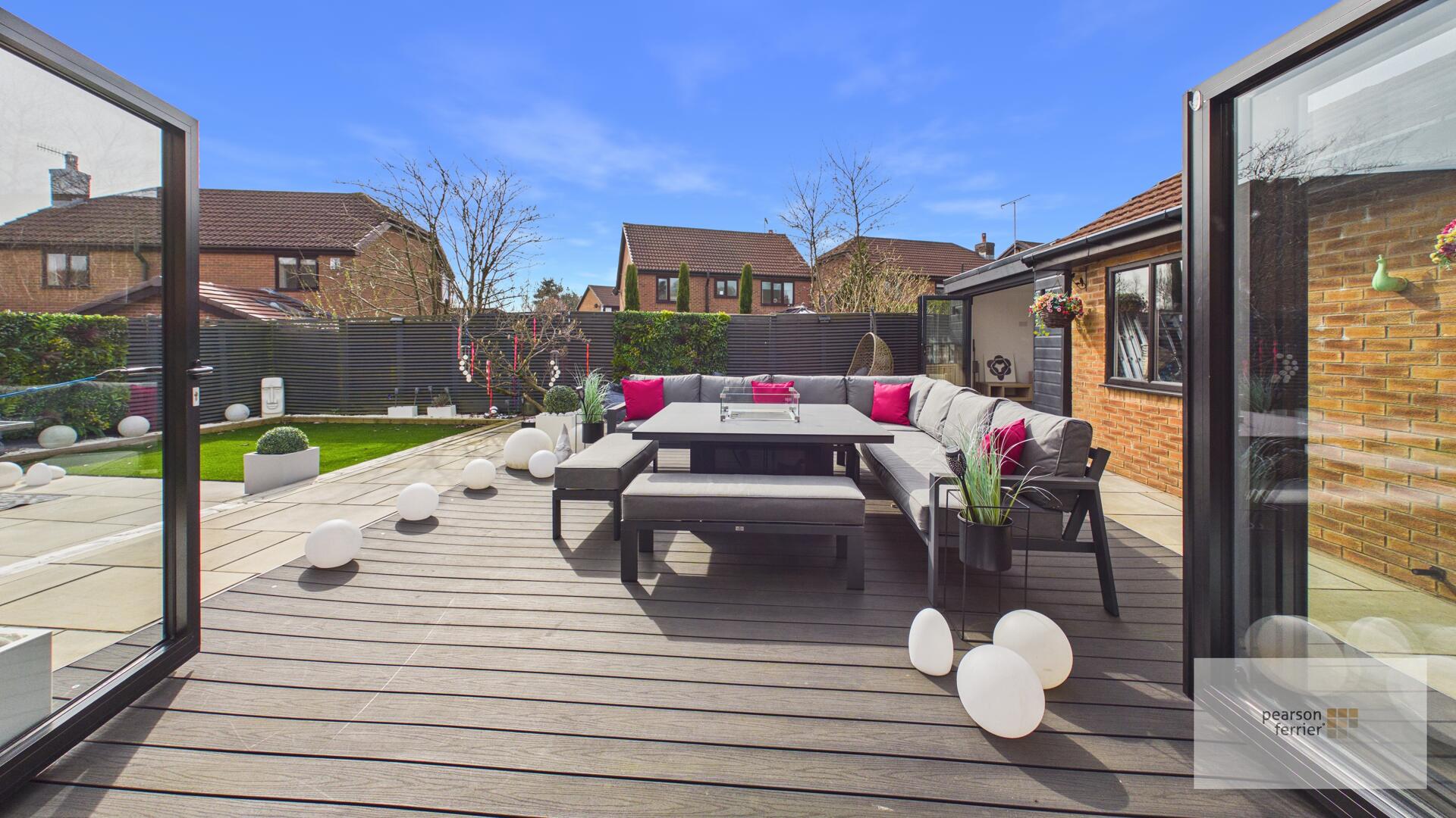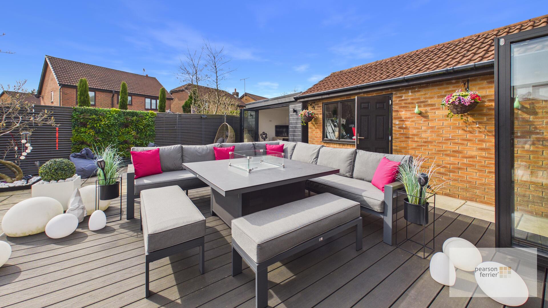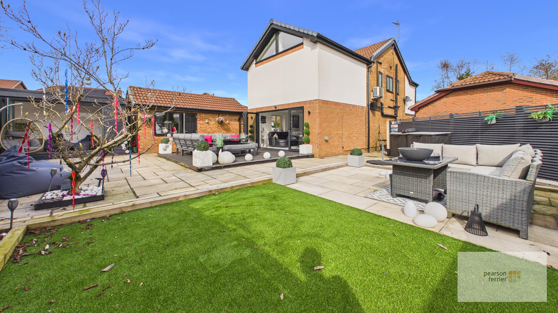 Outside there is a large adjoining area of land to the front with putting green and extensive parking/hardstanding ideal for a caravan or motorhome, paved forecourt and side driveway c/w EV charging point leading to a detached garage. There are large westerly facing professionally designed gardens at the rear with paved patio, composite decking and seating areas with astro turf lawns. There is also a garden studio pod ideal as an office or gym.