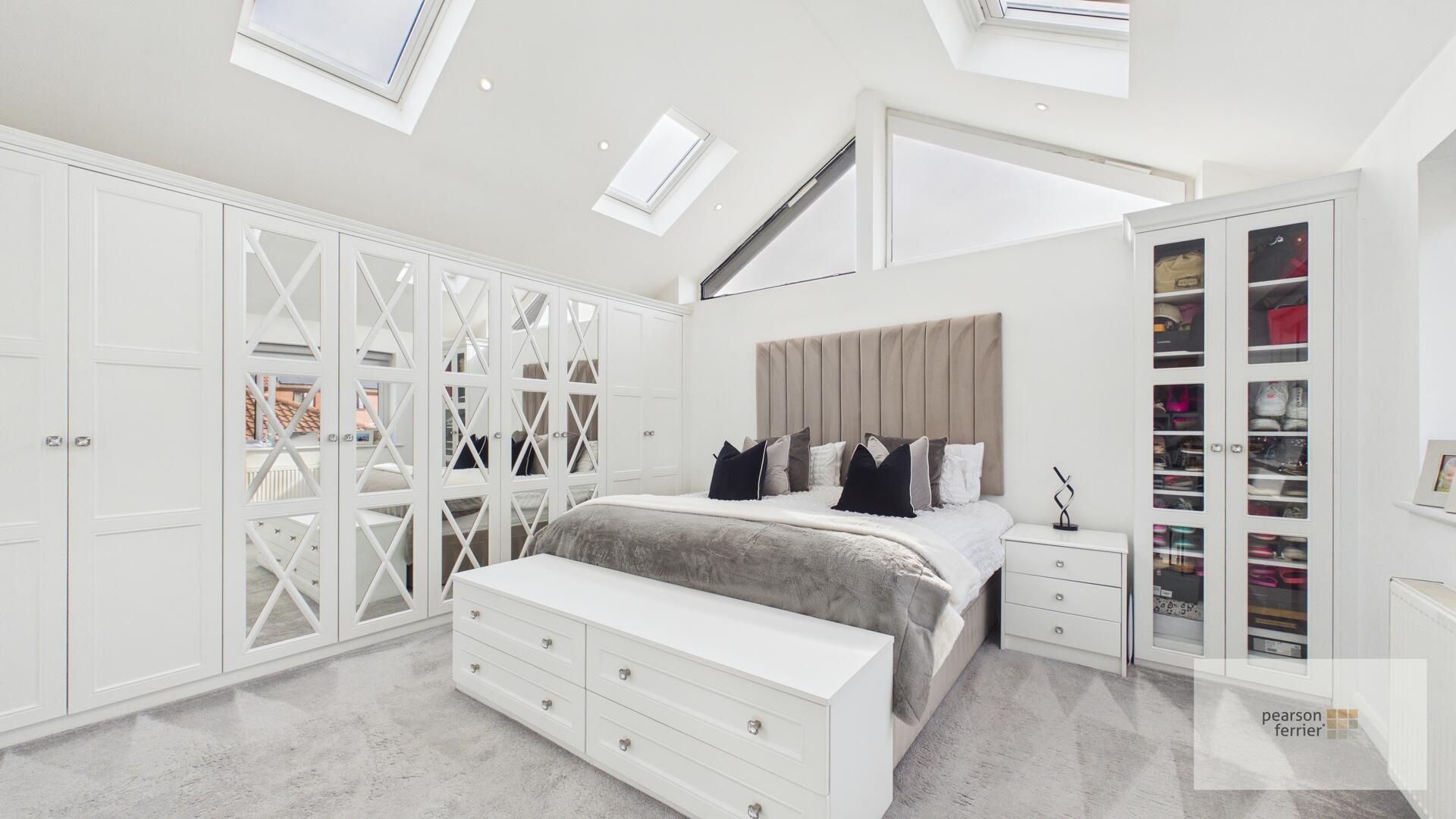 Recently extended with vaulted ceiling, 4 velux windows, air conditioning, range of fitted wardrobes with windows to the side and triangular feature at the rear. Large ensuite shower room comprising, wall mounted vanity basin, oversized shower, tiled elevations and flooring, heated tower rail and window to the side.