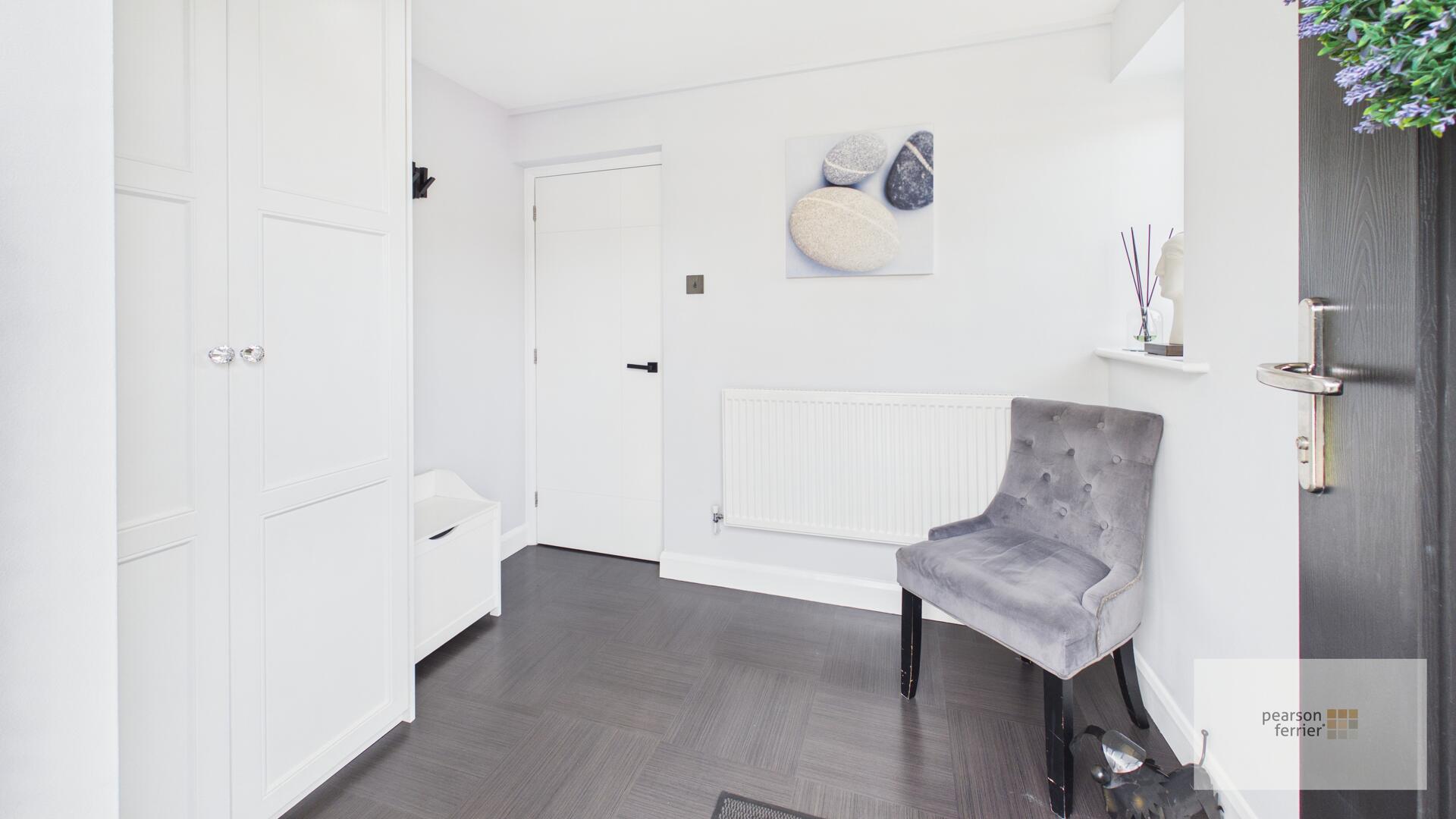 Rock door with Quickstep quadra lined flooring, fitted cloaks cupboard, radiator, alarm keypad and side window.