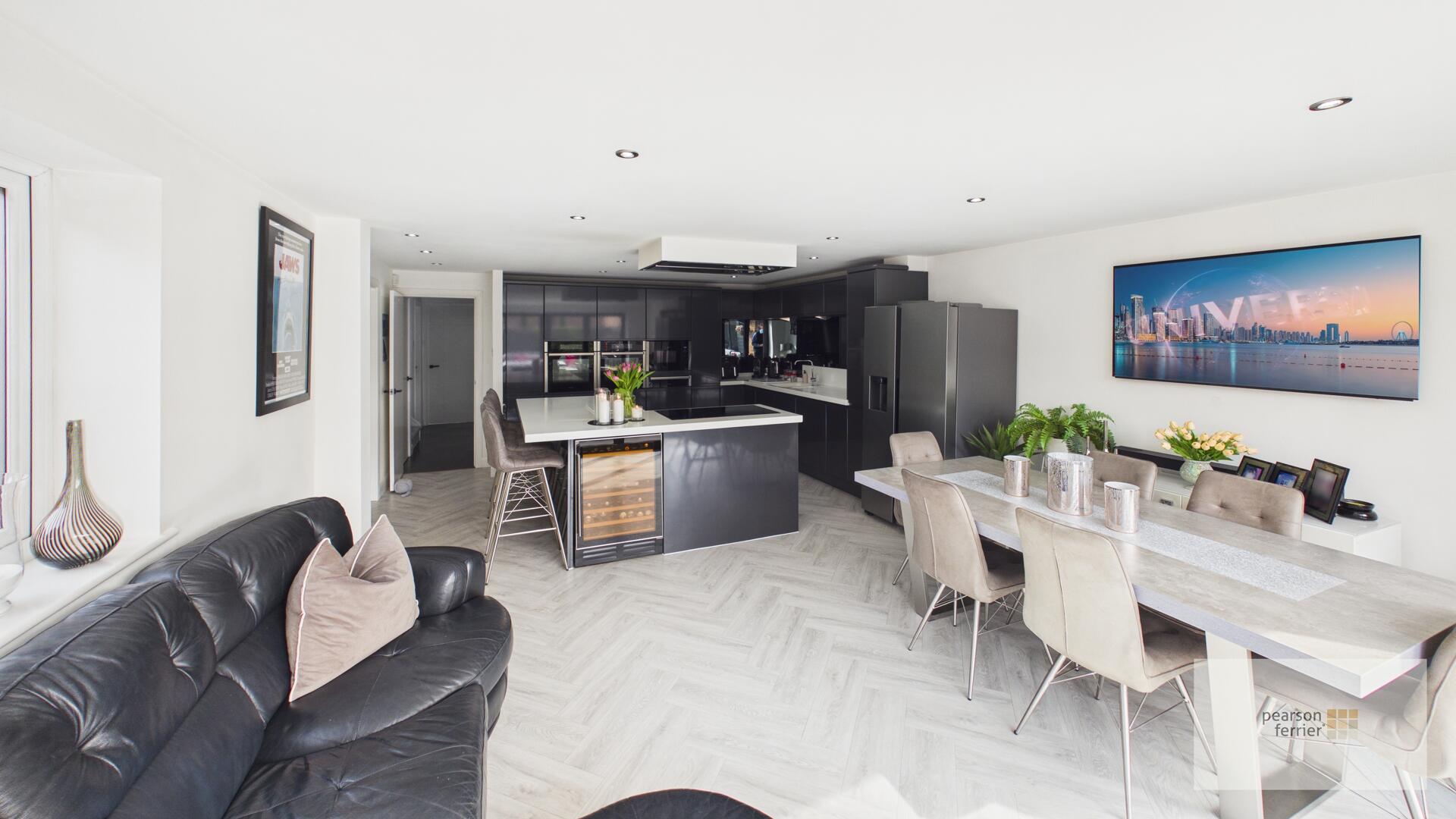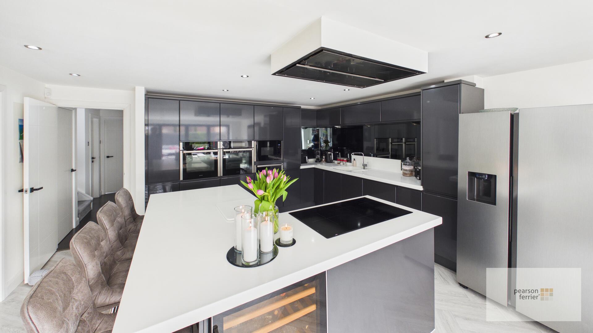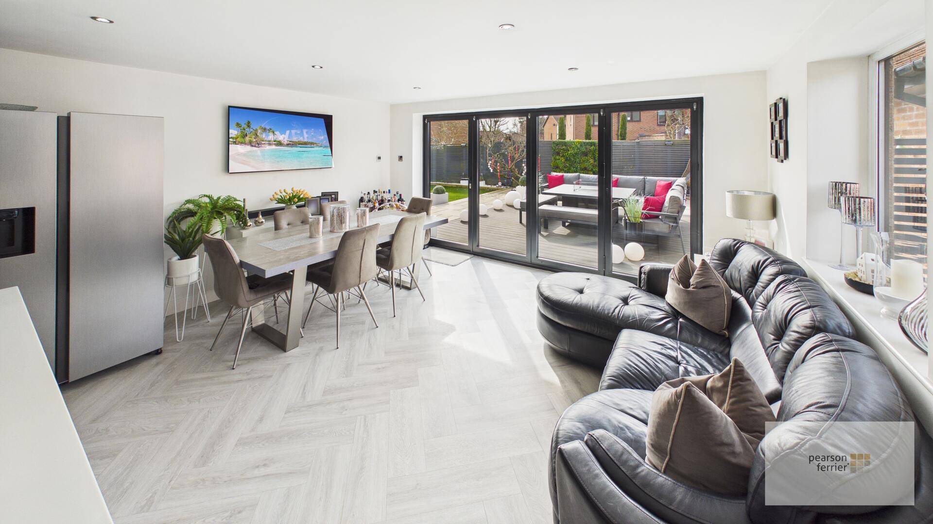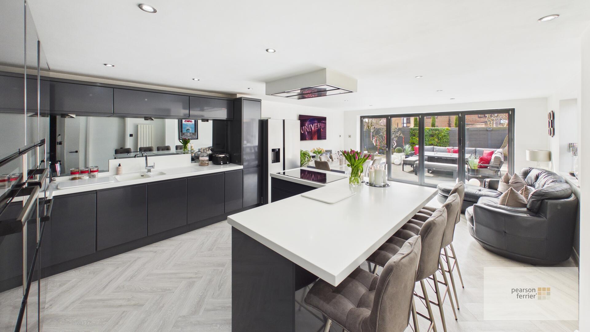 Stunning contemporary family kitchen and dining area with extensive range of wall and base units in grey, with complimentary ice white Corian worksurfaces, appliances include induction hob, double oven, microwave, plate warming drawer, extractor, dishwasher, grey Amtico luxury vinyl flooring with underfloor heating, bi-folding doors leading to the rear gardens