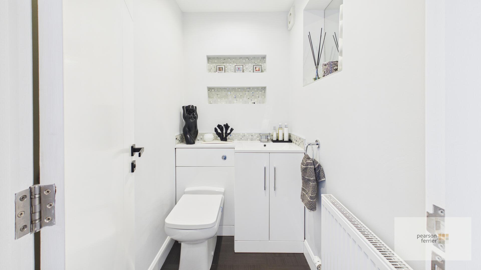 Duel flush WC, radiator, wash hand bason set in vanity with mixer tap, inset shelving and quickstep quadra lined flooring