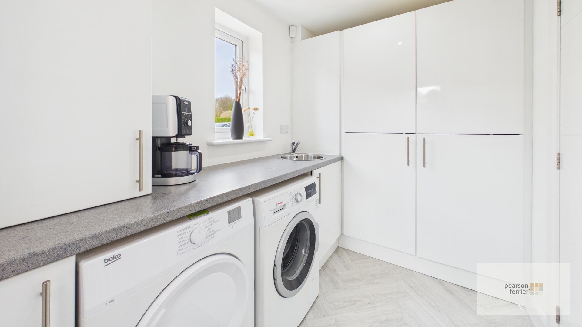 Wall and base units in white with inset sink, grey Amtico luxury vinyl flooring, gas fired boiler, window to the side and door to the rear.