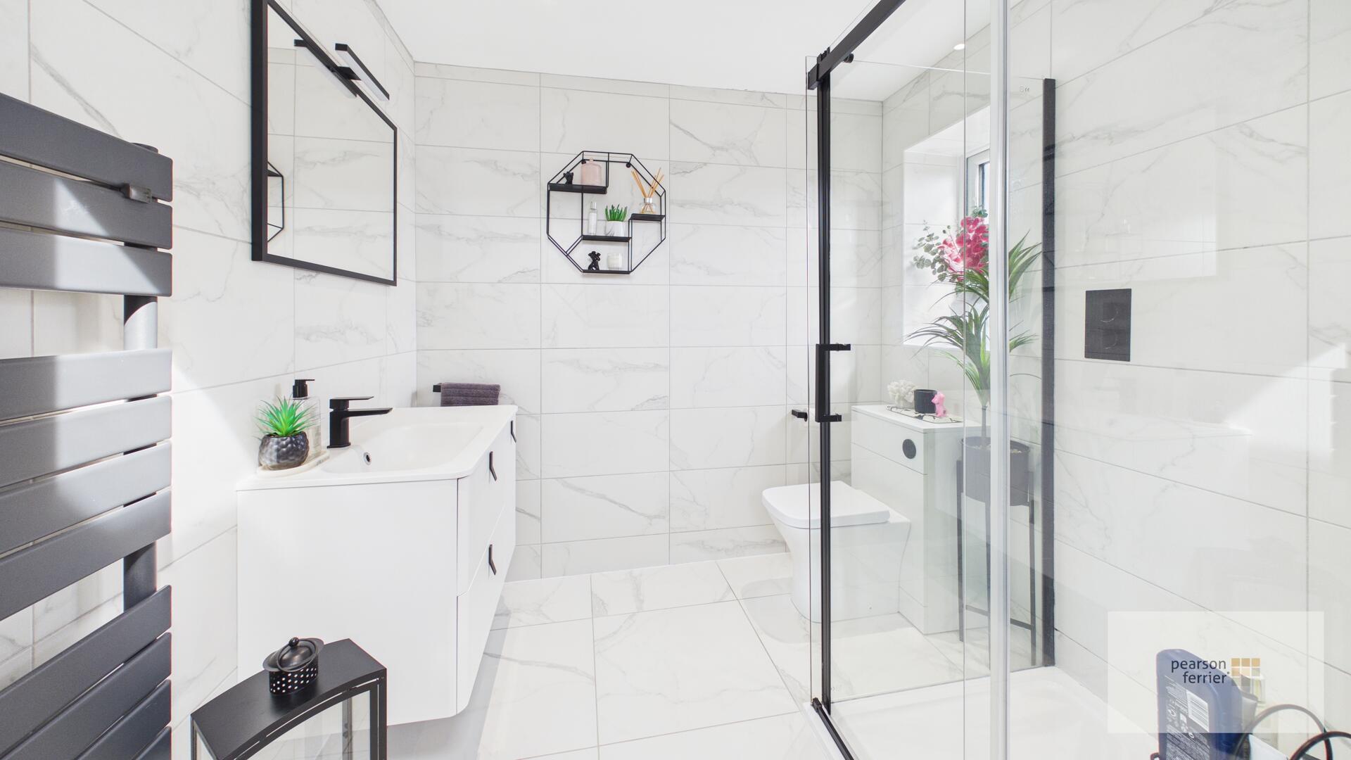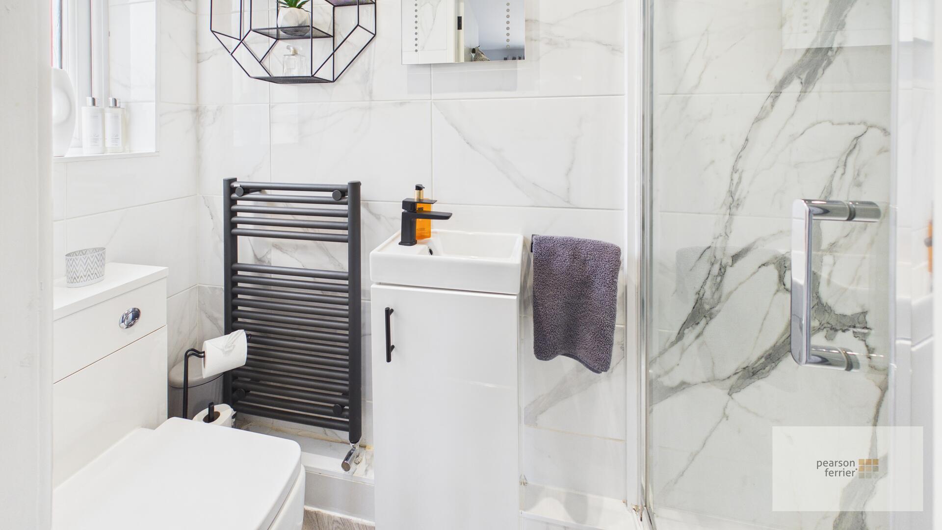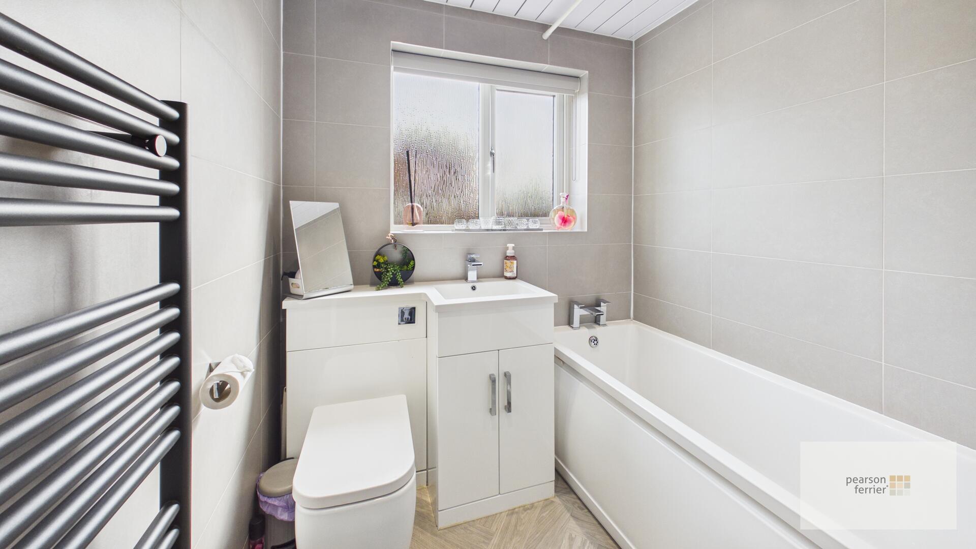 Comprising, wc, wash hand basin set in vanity, panel bath with shower over, tiled elevations, heated towel rail, window to the side.