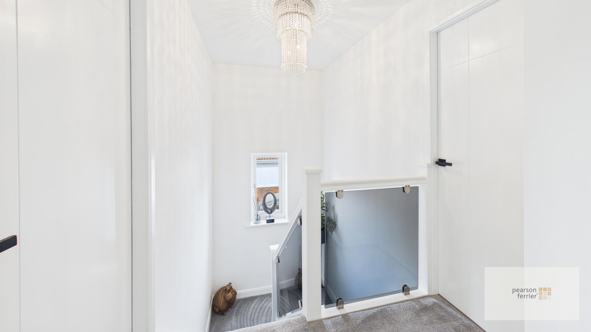 Landing area with built in cupboard, loft access with pull down ladder and window to the side.