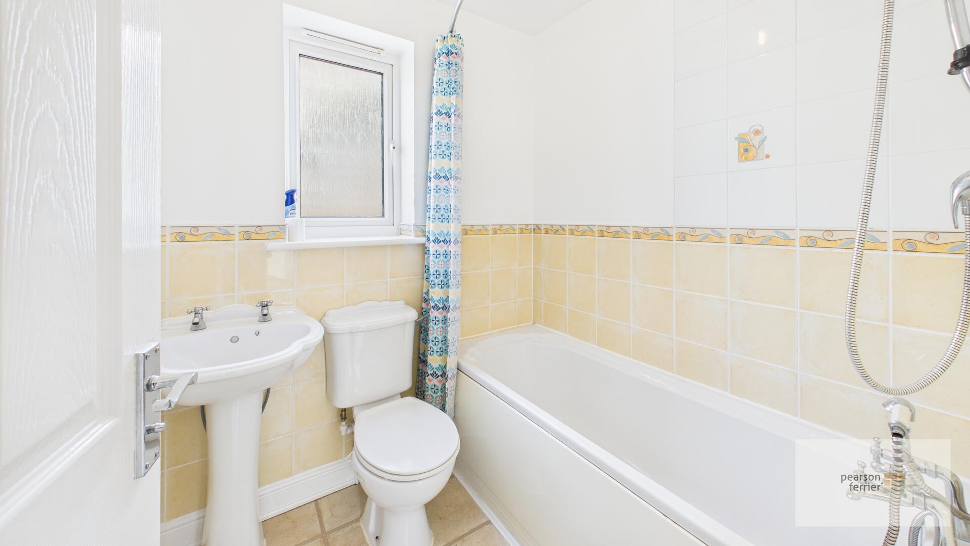 Briefly comprising, wc, wash hand basin and panel bath with shower over, tiled elevations, window to the side.