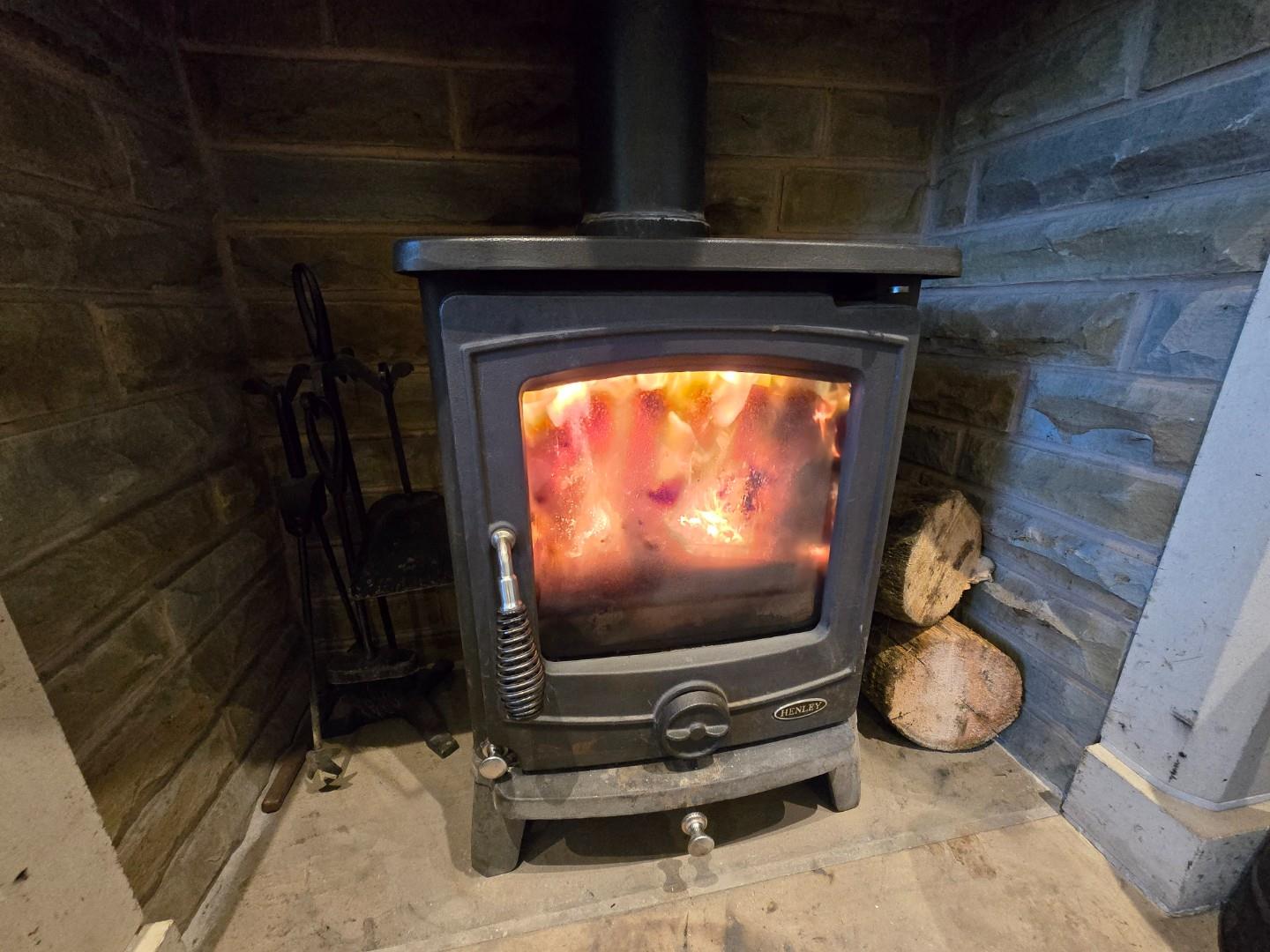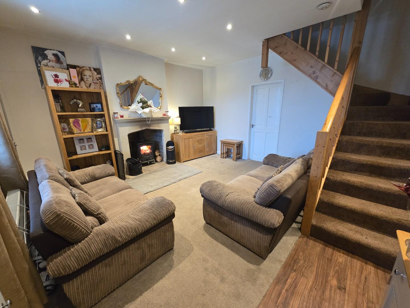 Has a front facing double glazed window with open views, radiator, spotlights, an under stairs storage cupboard and a log burner.