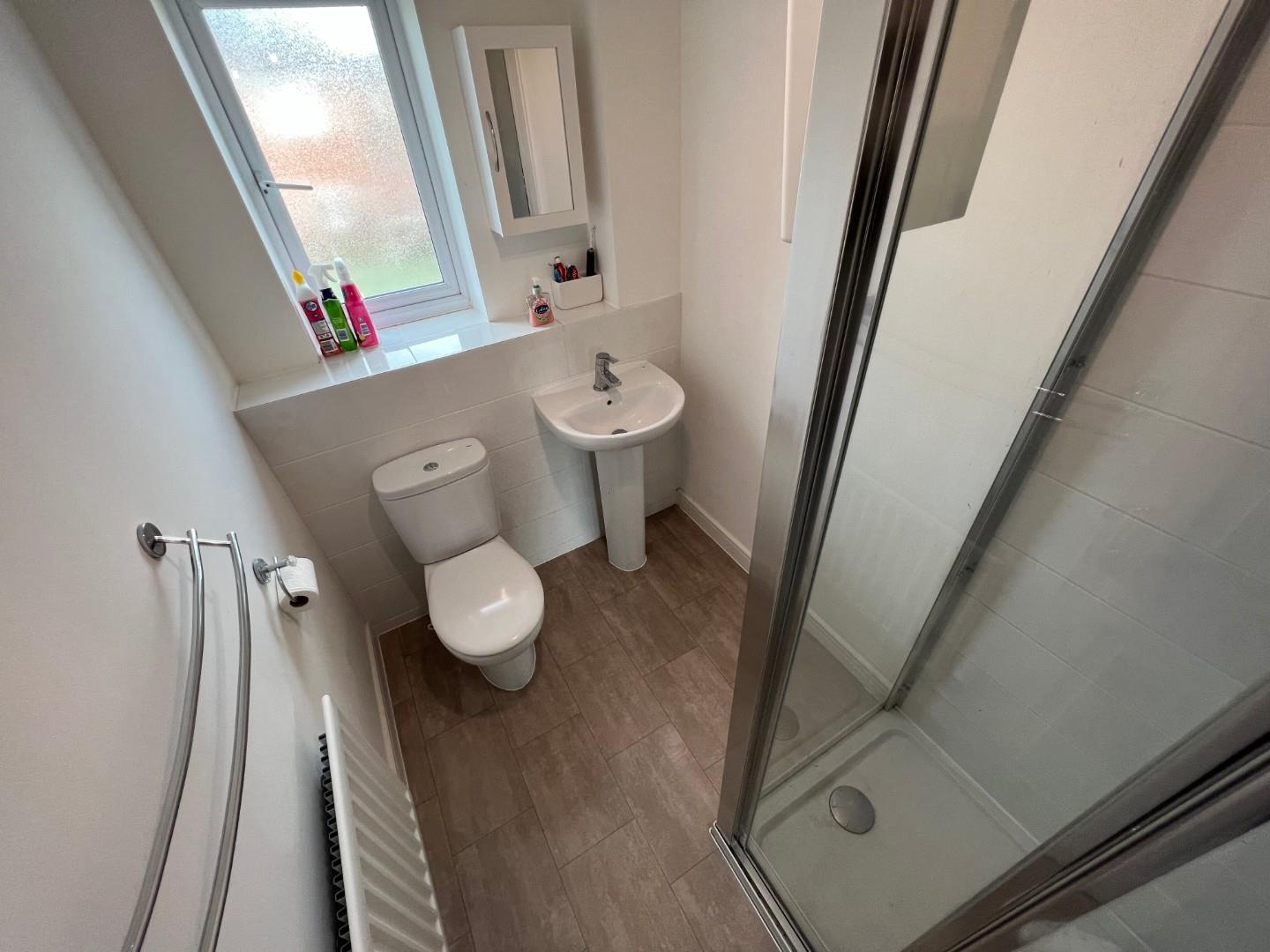 PVC double glazed window with frosted glass design, a three piece White suite comprising low level WC, pedestal wash hand basin and a corner walk in shower cubicle housing shower unit, splash back tiling to complement.