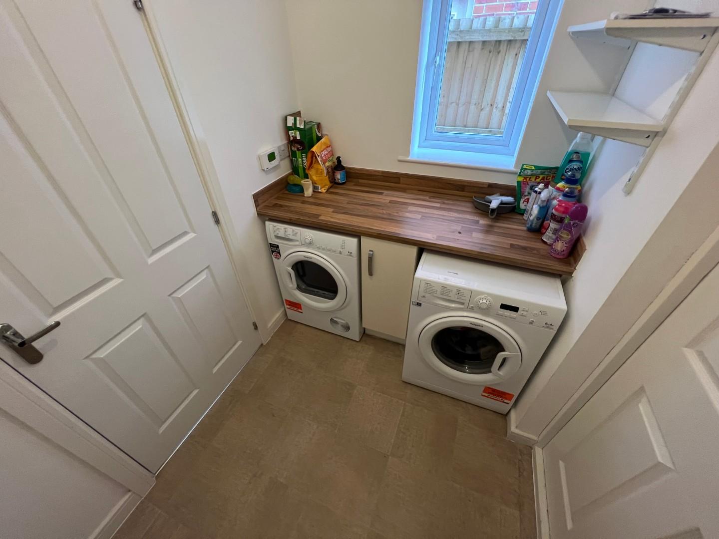 Fitted base units with complementary moulded work surface, plumbed for an automatic washing machine and vented for a tumble dryer access to: