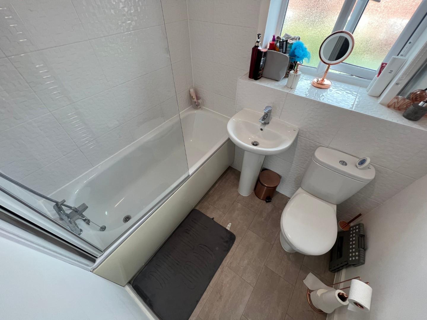 PVC double glazed window with frosted glass design, a three piece modern White suite comprising low level WC, pedestal wash hand basin and a panelled bath with shower over, splash back tiling to complement.