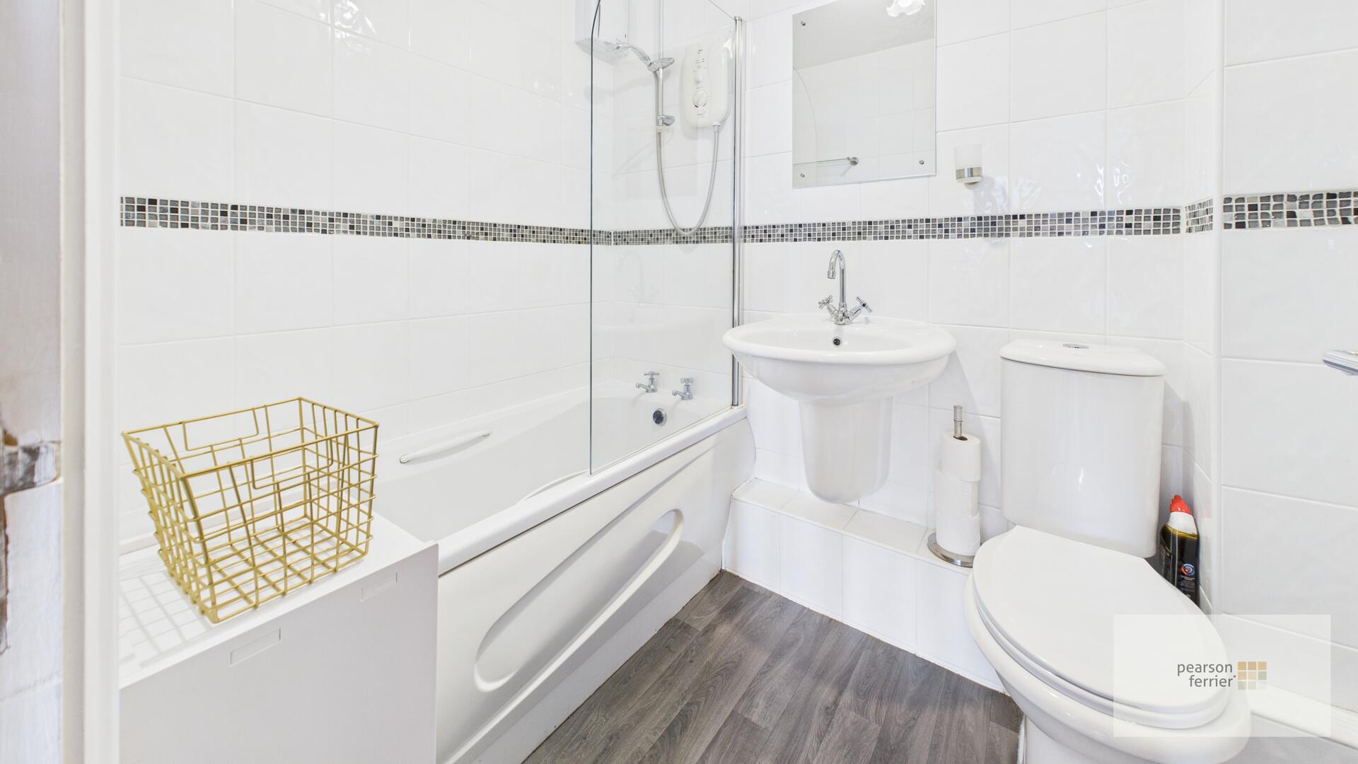 Three piece white suite comprising of; Low level w.c, wall mounted hand wash basin and panel bath with electric shower over, tiled elevations, heated towel rails, ceiling light point and extractor fan.